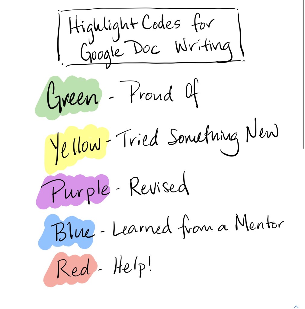 Another way to keep our feedback process efficient is to have students highlight certain things in their writing. During a typical writing conference we might ask a student to show us a part they loved, ask them to point to a place they revised, a place that isn’t working, etc. This helps us notice patterns and focus our feedback in person. Having students highlight the work they submit digitally will help us achieve a similar outcome and will bring in a little bit more of the self-reflection mentioned above.