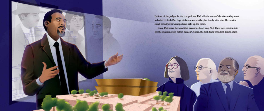Having a picture book biography published had been a goal of mine for years. I kept a running list of people whose lives would inspire kids. My computer held manuscripts in different stages of development. But another writing project always seemed to come first. Then, in the spring of 2017, my agent let me know that Cheryl Klein, editorial director of Lee & Low Books, was interested in seeing a nonfiction story about an architect who created the National Museum of African American History & Culture (NMAAHC). Here was my chance: Philip G. Freelon, the lead architect, lived nearby in Durham. I was excited about the possibility of celebrating his journey and incredible work of which the pinnacle was NMAAHC, a dream a century in the making.