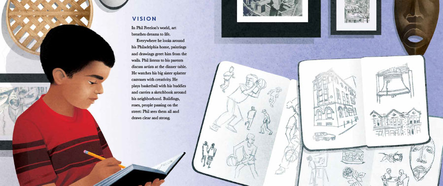 I knew I wanted to start with the idea that art was all around him as a kid. It called him to create. I also wanted to focus on how his grandfather taught him to experience the world through all of his senses and develop a special kind of sight. A theme began to emerge that Mr. Freelon could see between the lines. I liked it and wrote a draft. I revised and revised, but it lacked the spark that lets you know you’ve made magic.