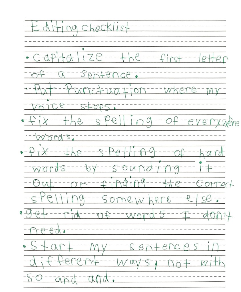 When we transitioned from poetry back to prose, I encouraged Isabelle to take what she had learned about editing to create a new editing checklist. I encouraged her to look at her previous editing checklists, to think about things she had been working on as a writer. Next, I encouraged her to create a new editing checklist. First, she began jotting ideas in her notebook. Once she got her ideas down, I asked her to whittle the list from six to four things. Isabelle refused since she asserted she had several things she needed to work on during her editing minute. Rather than argue, I encouraged Isabelle to make a clean, out-of-the-notebook copy of her checklist to keep in her writing folder. Here’s her final editing checklist: