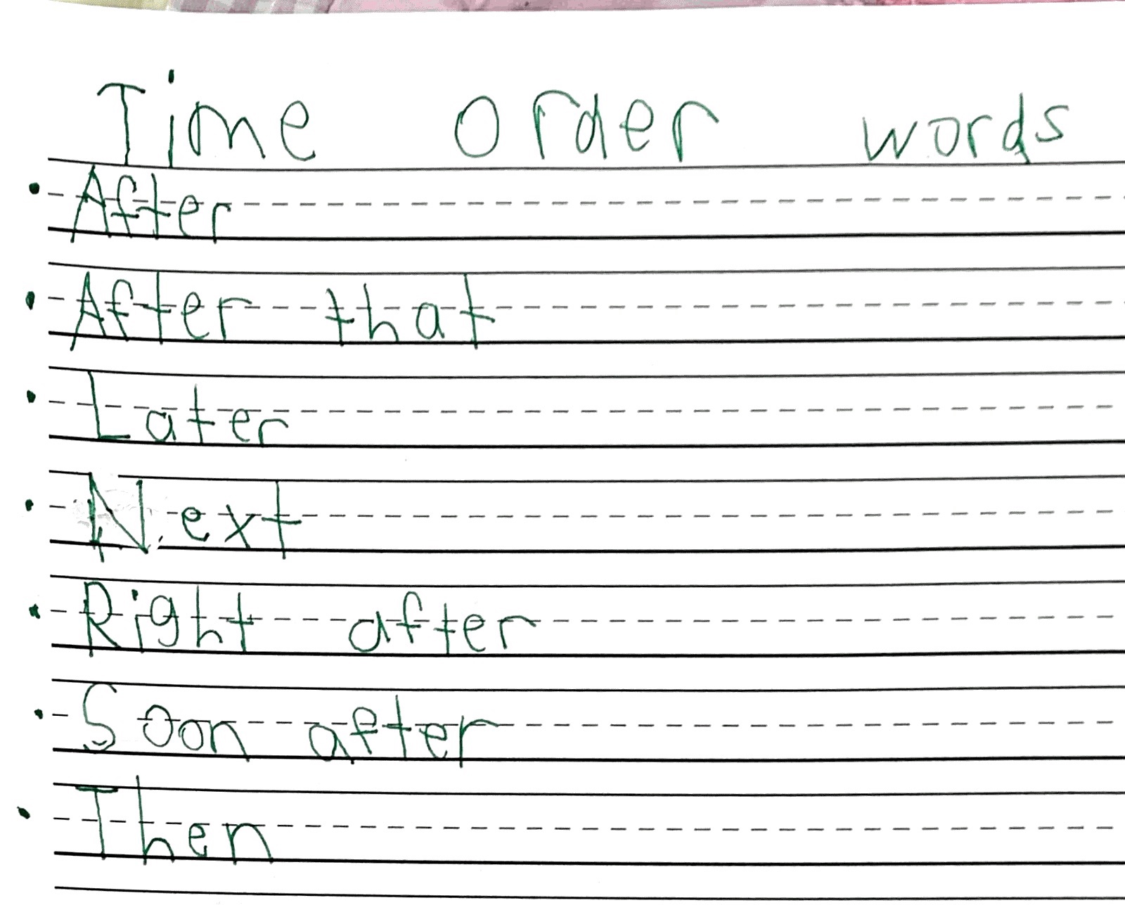 A few days later, Isabelle realized she needed a cheat sheet of transitions to help her vary the way she started her sentences since she was trying to eradicate the words and and so at the beginning of her sentences. We chatted about possibilities. Then, Isabelle wrote down the words and short phrases she liked.