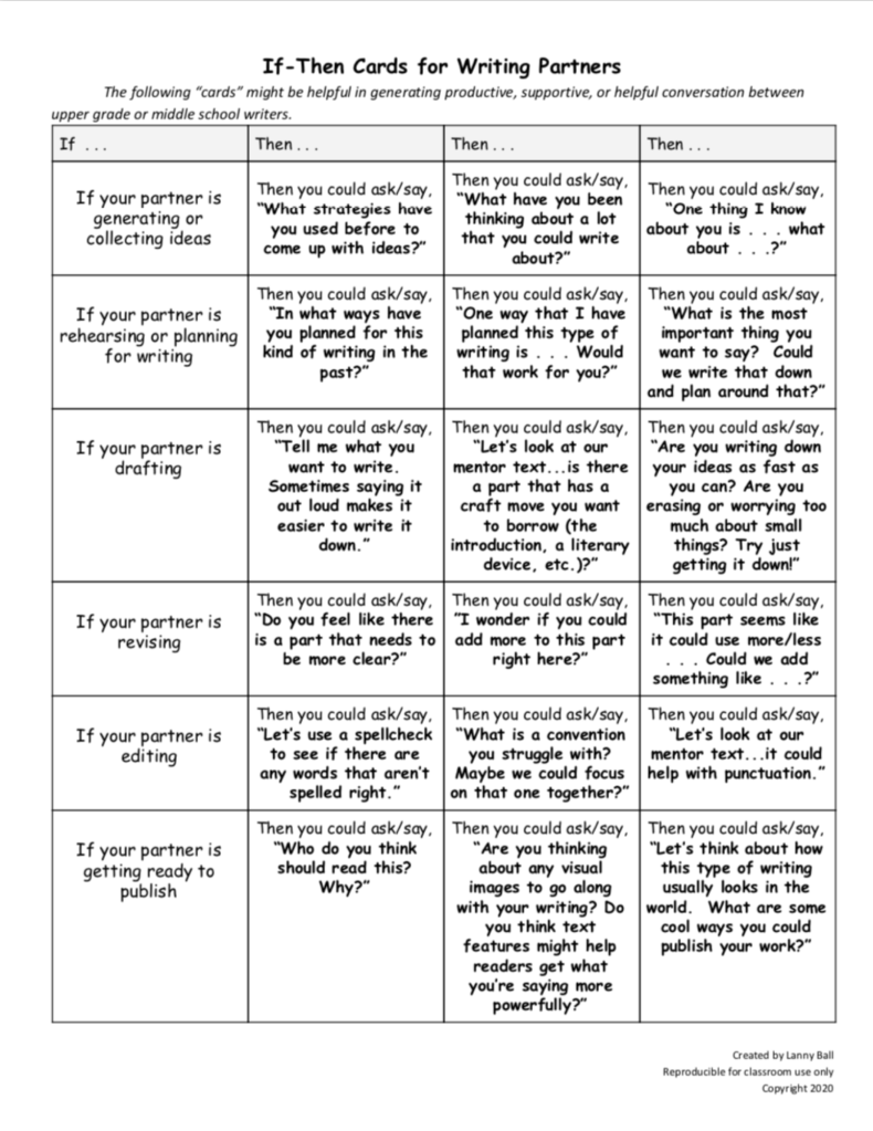 In sports, there exist many if-then scenarios. Take the soccer example I describe in the introduction: If he does this, then I do that. In other words, if this, then that. Baseball or softball are similar – if a runner is on this base, then the throw goes there. But if multiple runners are on base, then throw goes there. Again, if this, then that. Understanding these scenarios and knowing (having been taught) how to react within each of them helps to create more potential success for the players. A few years ago, the writers and thinkers at the Teachers College Reading and Writing Project in New York created a beautifully helpful resource that draws upon this way of thinking entitled the If-Then Curriculum book (available as part of the Writing Units of Study). What if we were to take this idea to partnerships? Below is a resource I have created to help writing partners support one another, whether in person or in remote connections. This tool might be something you may wish to introduce in phase three of a curriculum of partnerships during which partners learn ways to provide feedback to one another (see this post for a three-part phase-in schedule for writing partners).