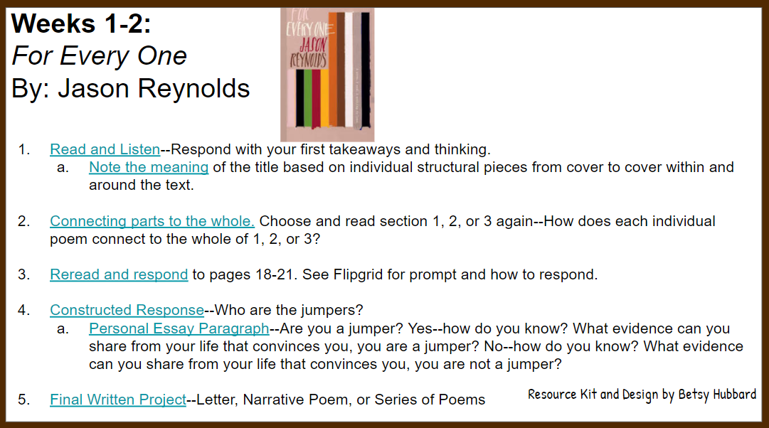 This unit links back to examples of the first unit and digital notebook examples as mentors. It also has a map of standards, slides of lessons for each text, and a digital notebook for students to utilize as they collect and write about the beautiful stories I share. The three texts are, For Every One by Jason Reynolds, Words with Wings by Nicki Grimes, and They Call Me Güero by David Bowles.