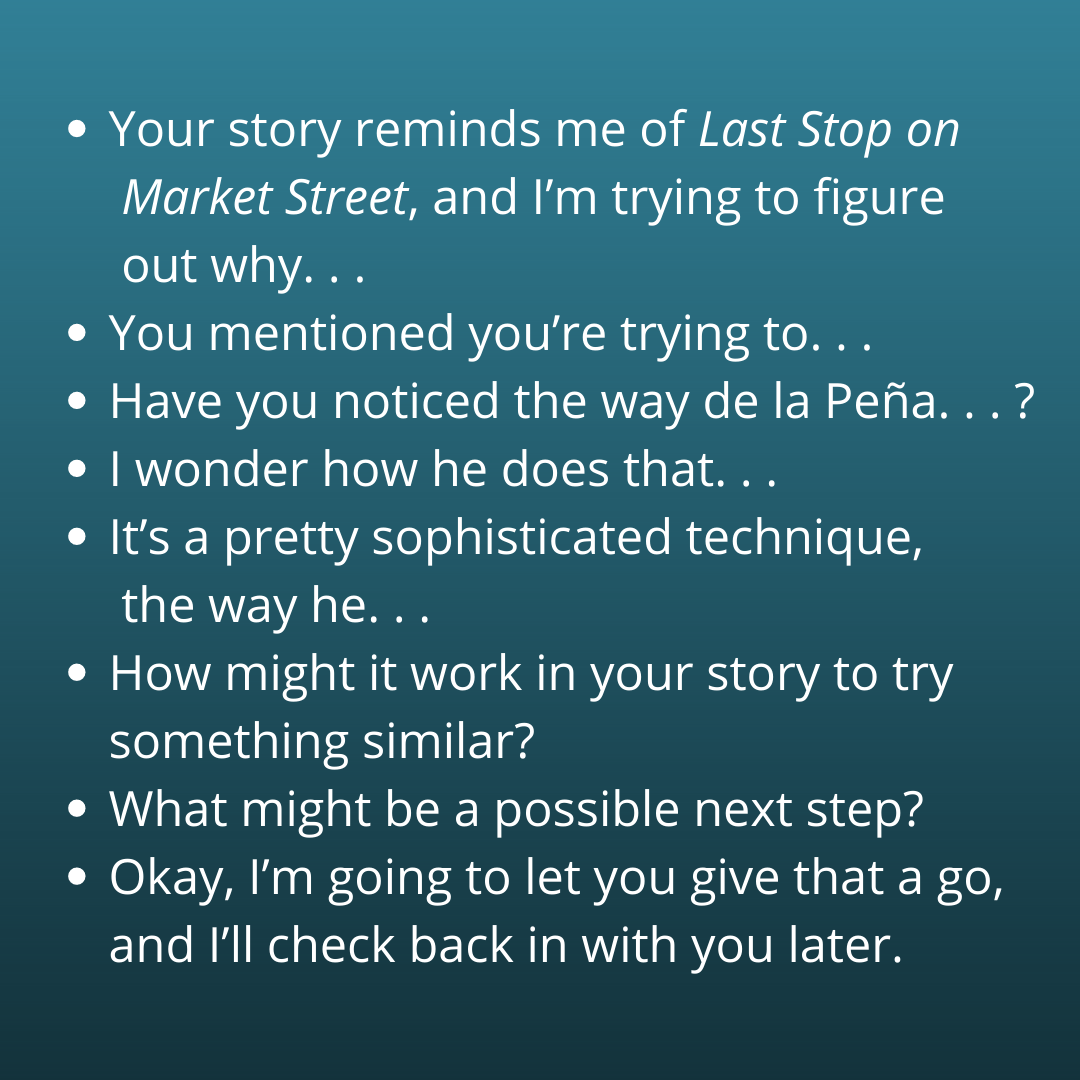 There’s a reason that I jot these noticings down as questions rather than as a list of specific craft moves. My goal is to use the text to wonder alongside a writer rather than directly offering suggestions that might be perceived as “extra work.” I want to be able to plant a seed, offer a compelling question that hooks the writer, and then walk away.