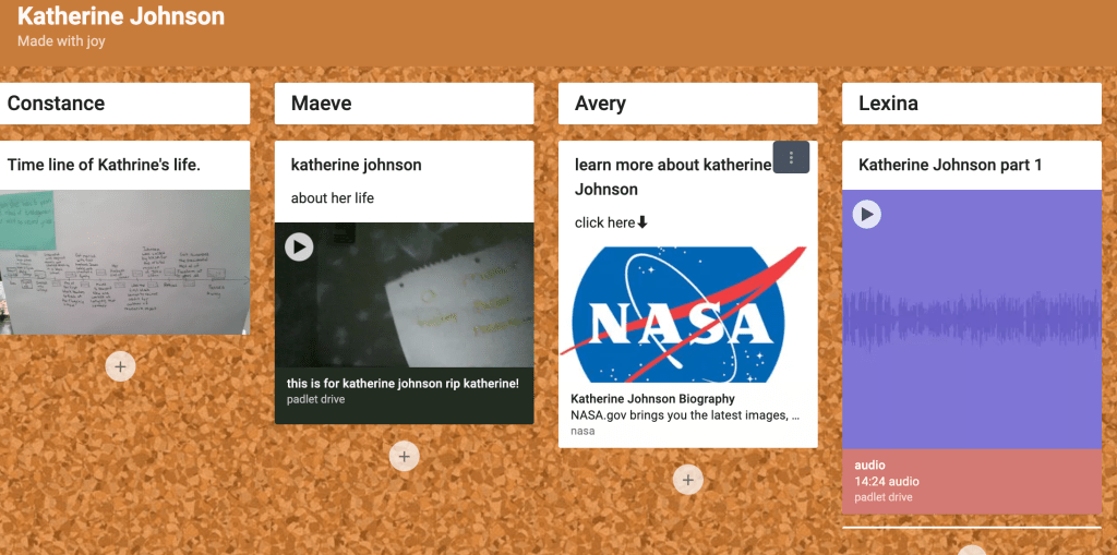 If we are in a virtual situation, then classrooms would create their own classroom slide in order to inform and inspire others. The school could have an entire slide deck representative of the books and people students learned about. Depending on the level of technological expertise, other options exist as well. A Padlet could be created, with each classroom having a column. As an example one of the third grade distance learning classes created a Padlet in response to Katherine Johnson. You can see some of the students’ contributions below. If a whole school were taking part, then the book could be at the top of the Padlet, and each of the students’ contributions below.