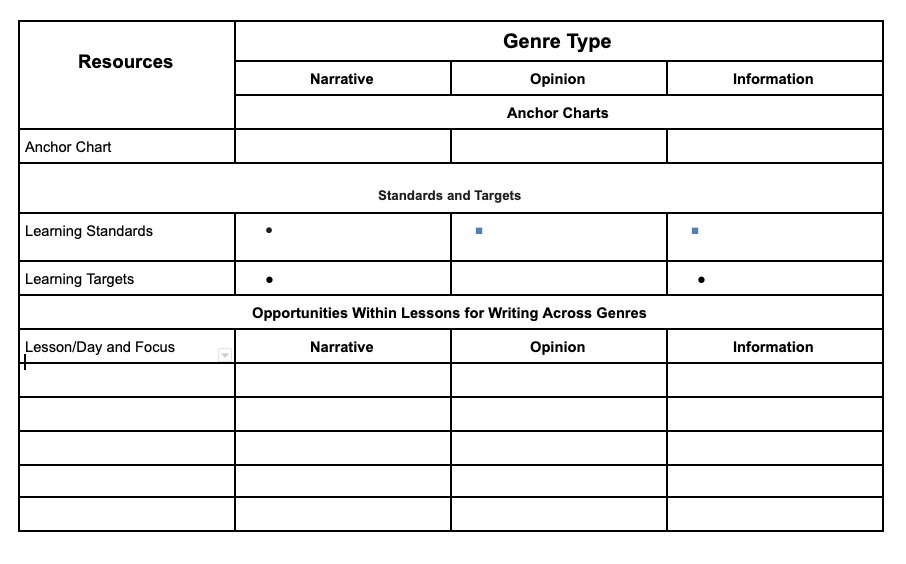 With those questions in mind, I created templates for each grade that I’m happy to share. Then, I went through each lesson or learning sequence, on the hunt for writing suggestions across genres.