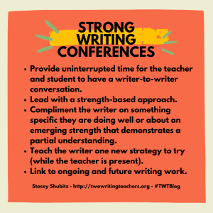 Regardless of whether we’re teaching in-person or virtually, there are several attributes of a strong writing conference. (Click on the image to enlarge.)