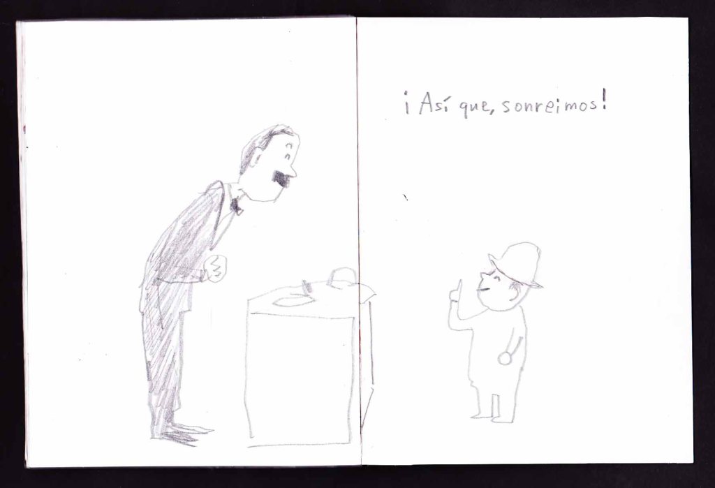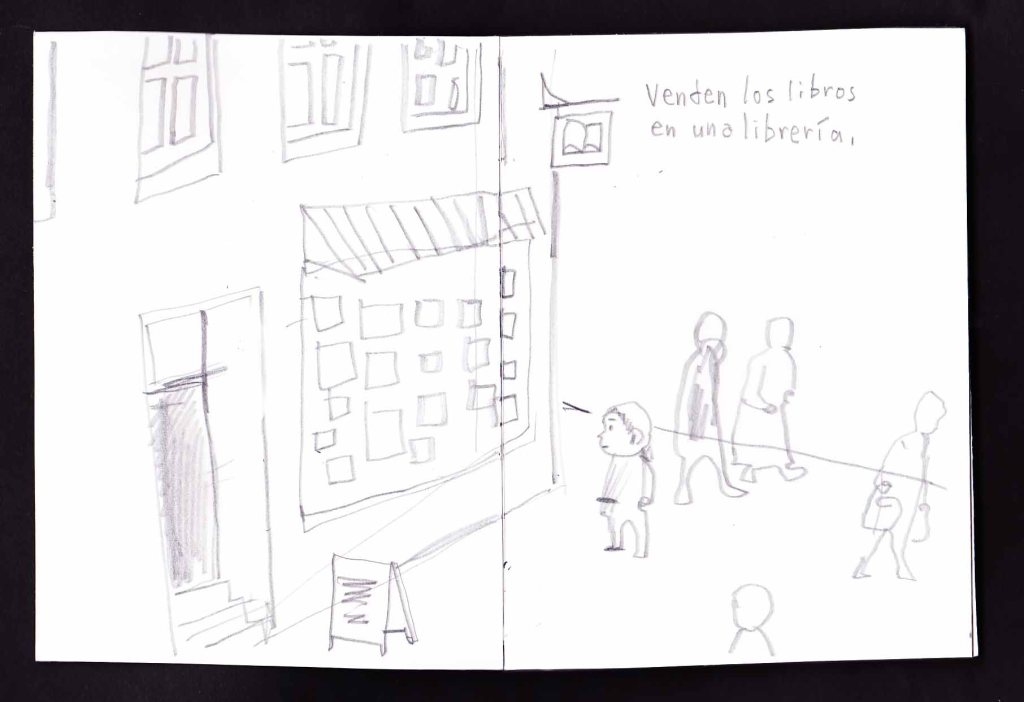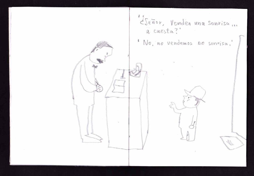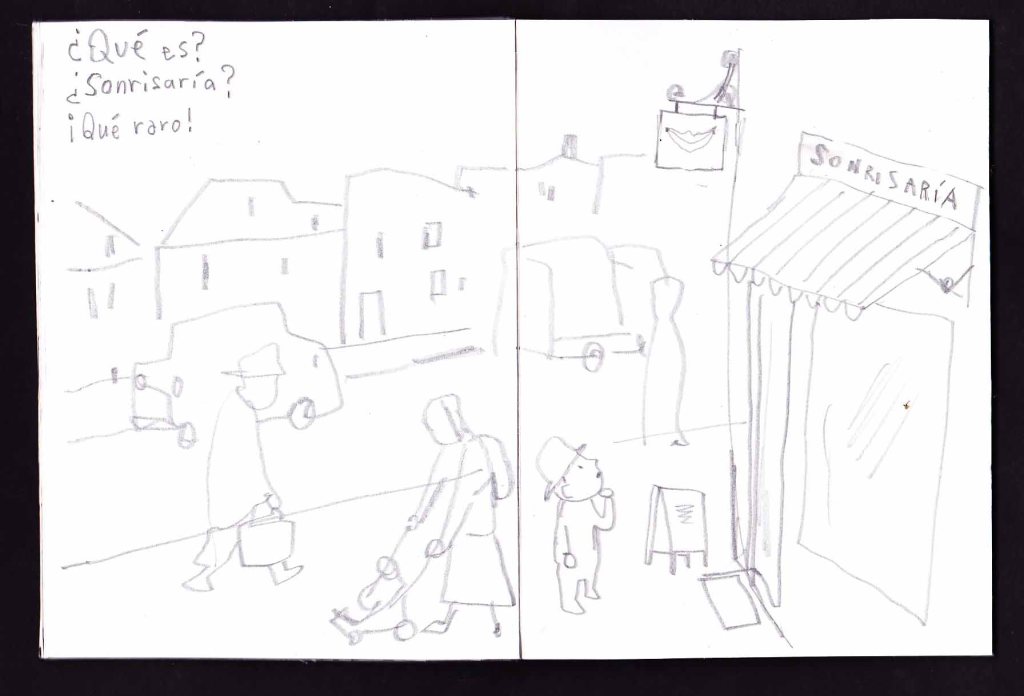 “Librería” means bookshop, and likewise “panadería” bakery, “verdulería” vegetable store and so on. I thought the suffix -ría would make it sound like a shop. So, “sonrisaría” would be a shop that sold smiles. Almost immediately I got a story! I drew pictures and added some text in my very basic Spanish in pencil on the back of some proof sheets.
