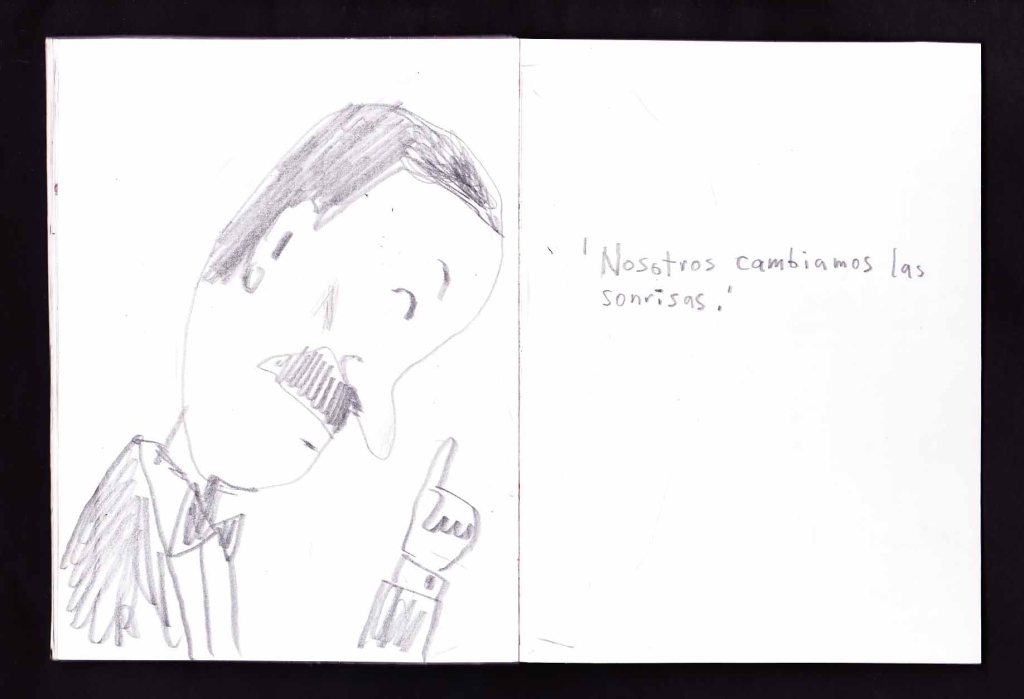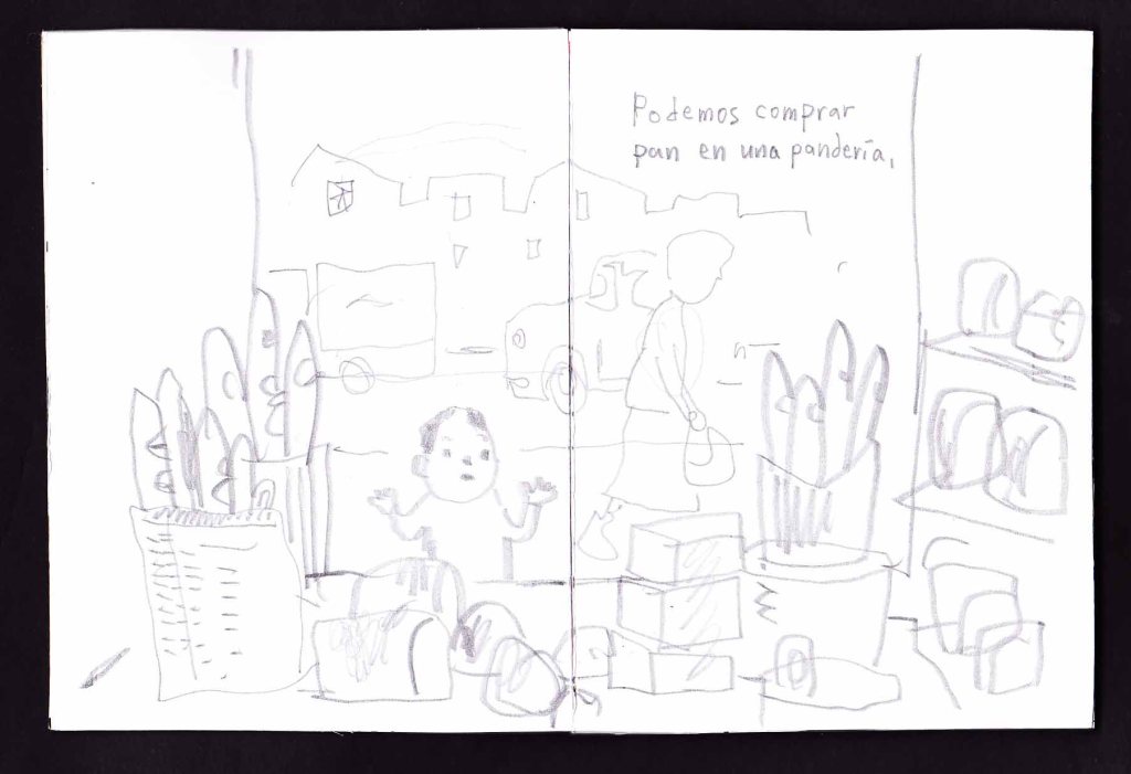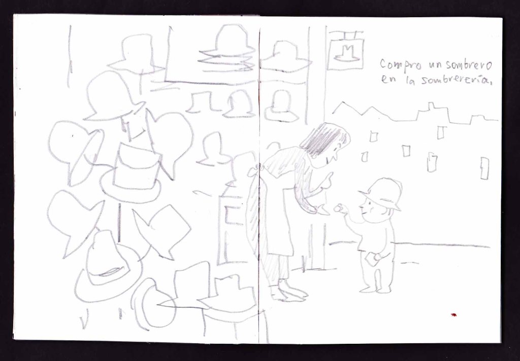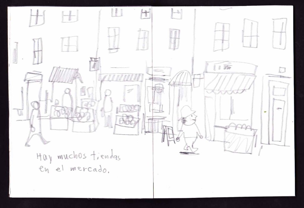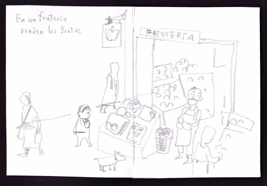 “Librería” means bookshop, and likewise “panadería” bakery, “verdulería” vegetable store and so on. I thought the suffix -ría would make it sound like a shop. So, “sonrisaría” would be a shop that sold smiles. Almost immediately I got a story! I drew pictures and added some text in my very basic Spanish in pencil on the back of some proof sheets.
