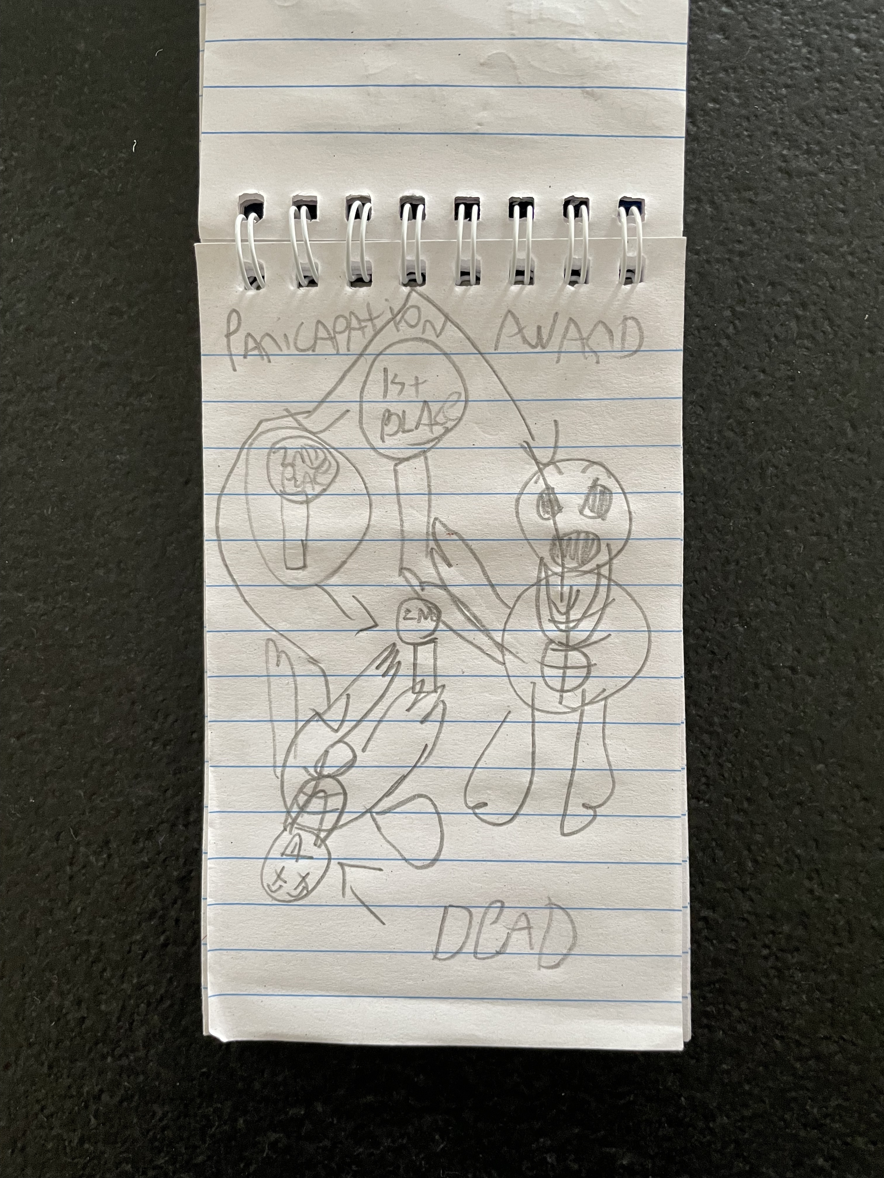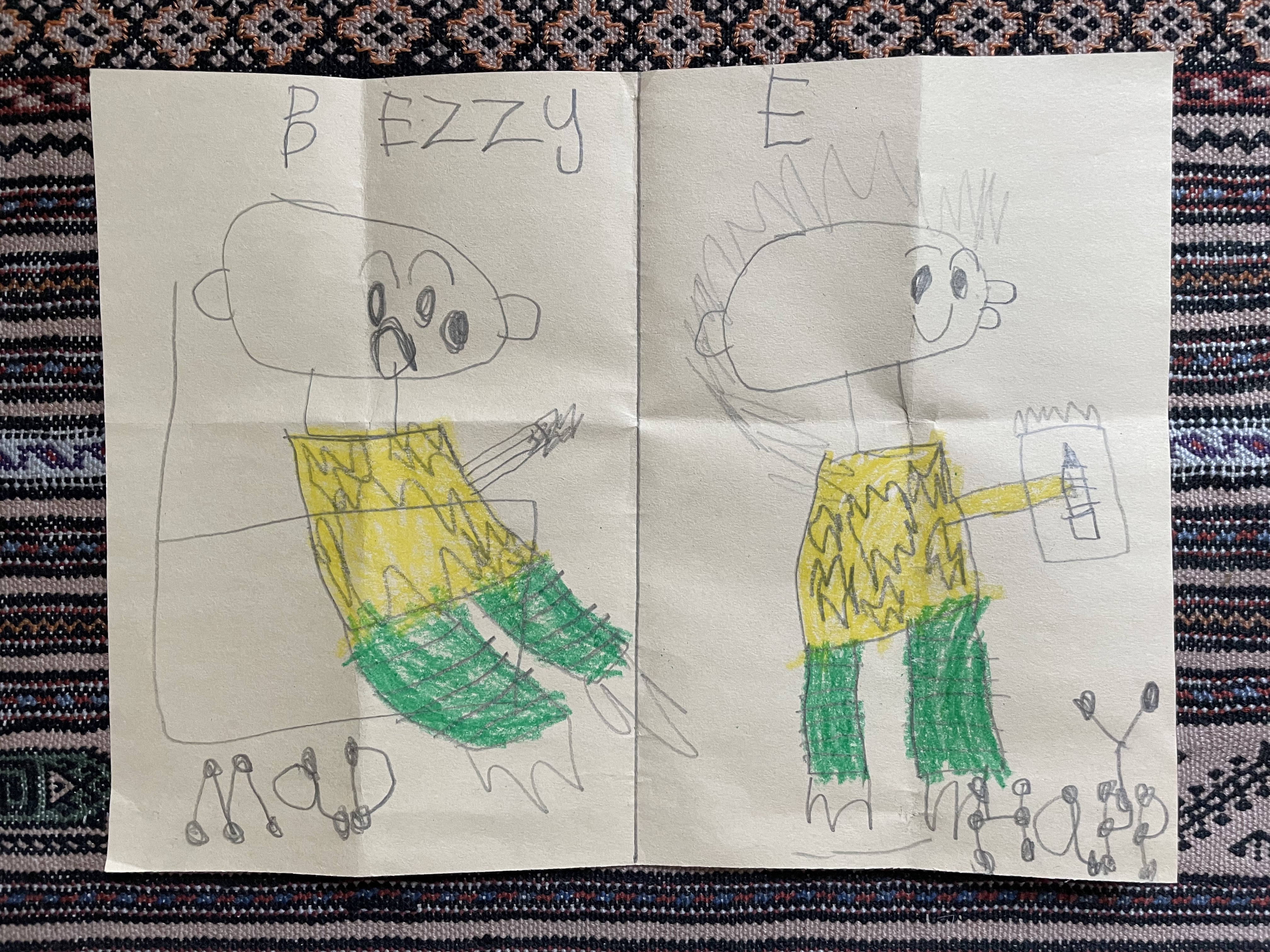 And then there’s Ezzy’s drawings of school busses and cartoonish cats, rocket ships or people – with a few feeling words like MAD and HAPPY labeled too.
