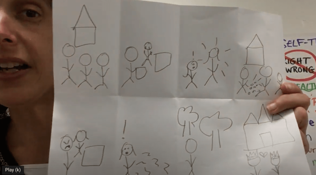 - In the first rectangle, loosely draw (10-15 sec!) a rough sketch of what’s happening at the beginning. Stick figures are encouraged! No one will look at what we’ve drawn but ourselves, so we’re the only ones who need to recognize the drawings. No words, just pictures or symbols.
