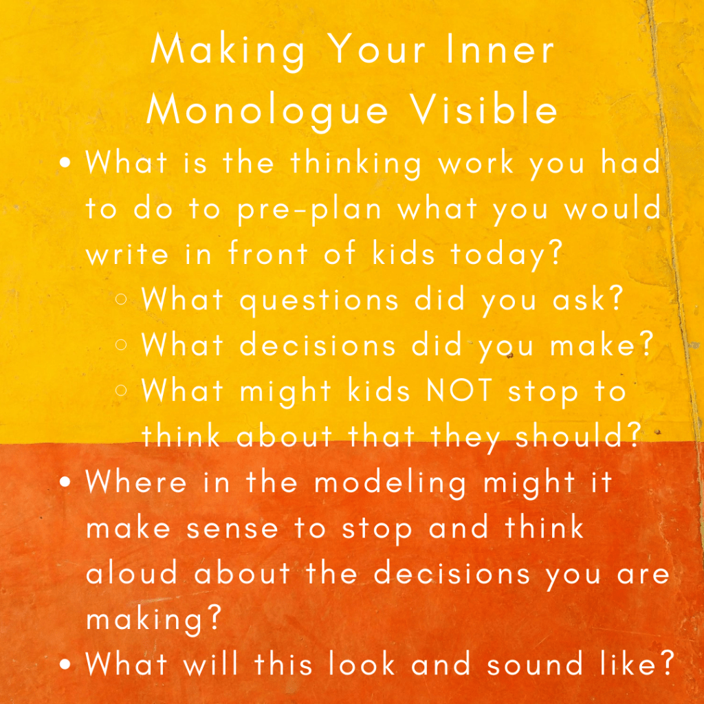 - What kind(s) of questions might you ask yourself aloud to surface this thinking as you are writing in front of kids?