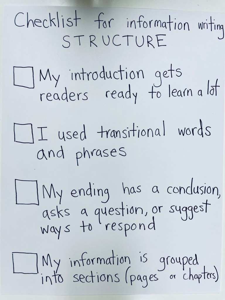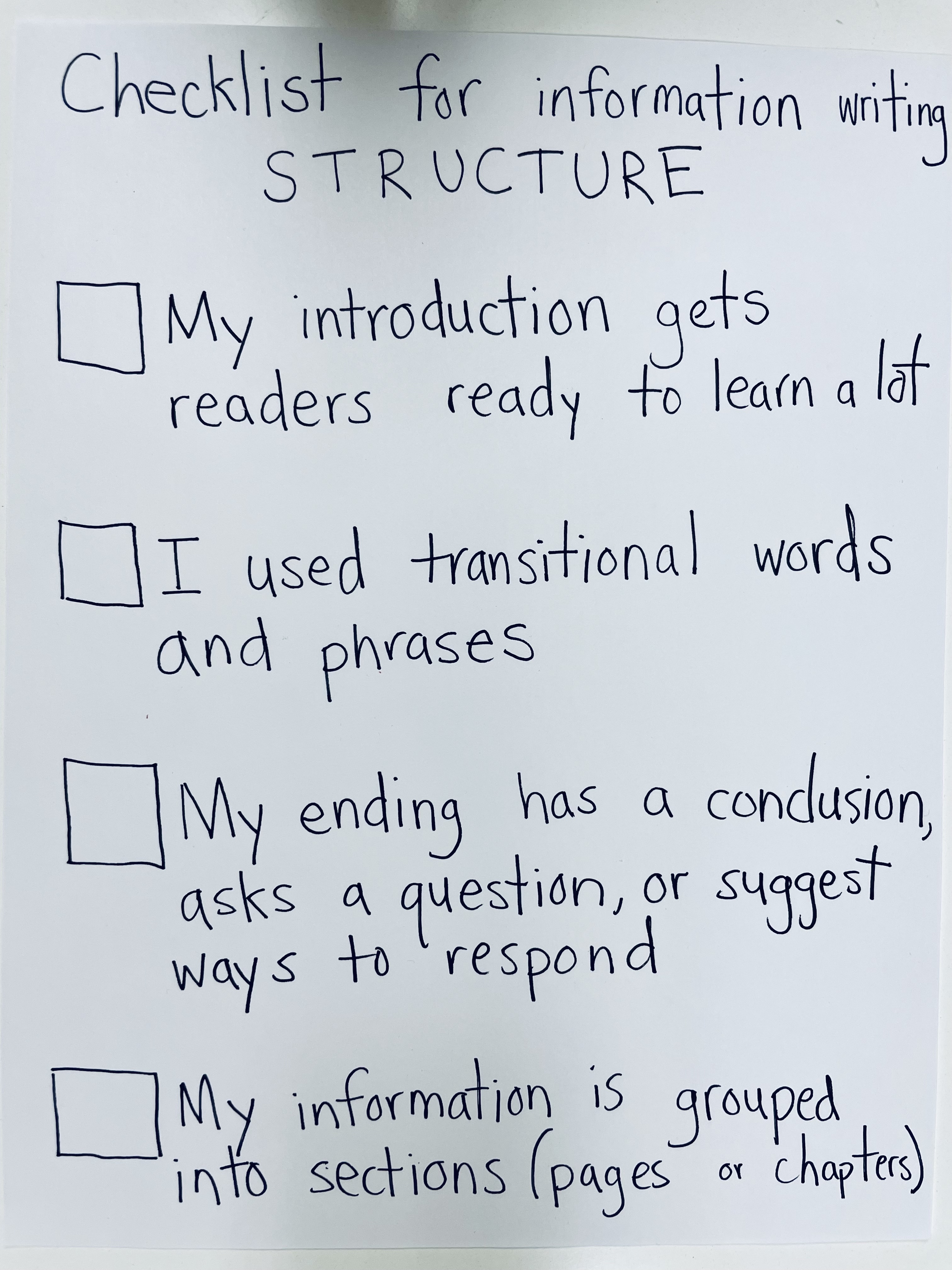 My 3rd graders are starting informational writing. I Love the checklist on a chart. I have given my students charts for the writing notebooks but they often lose them.