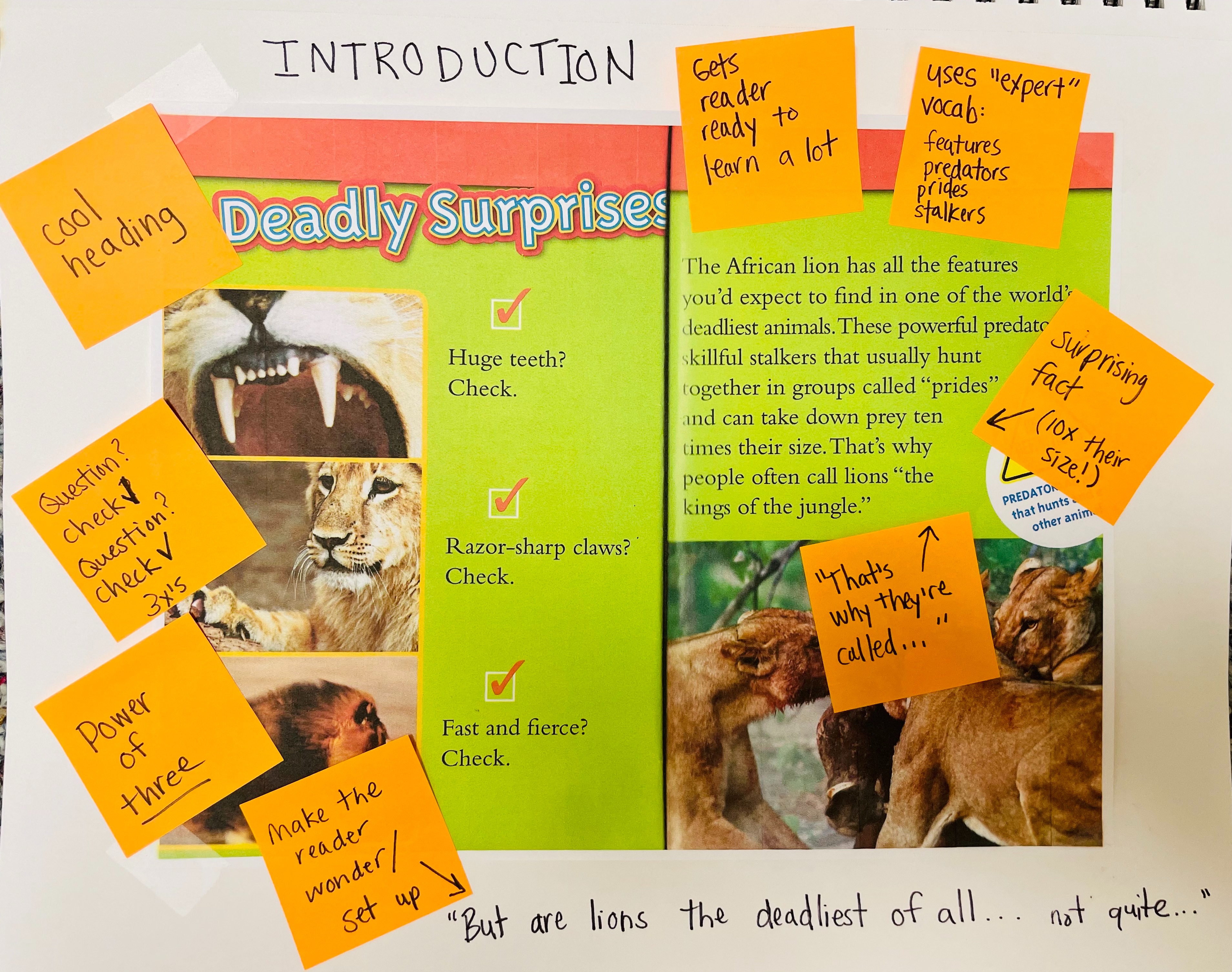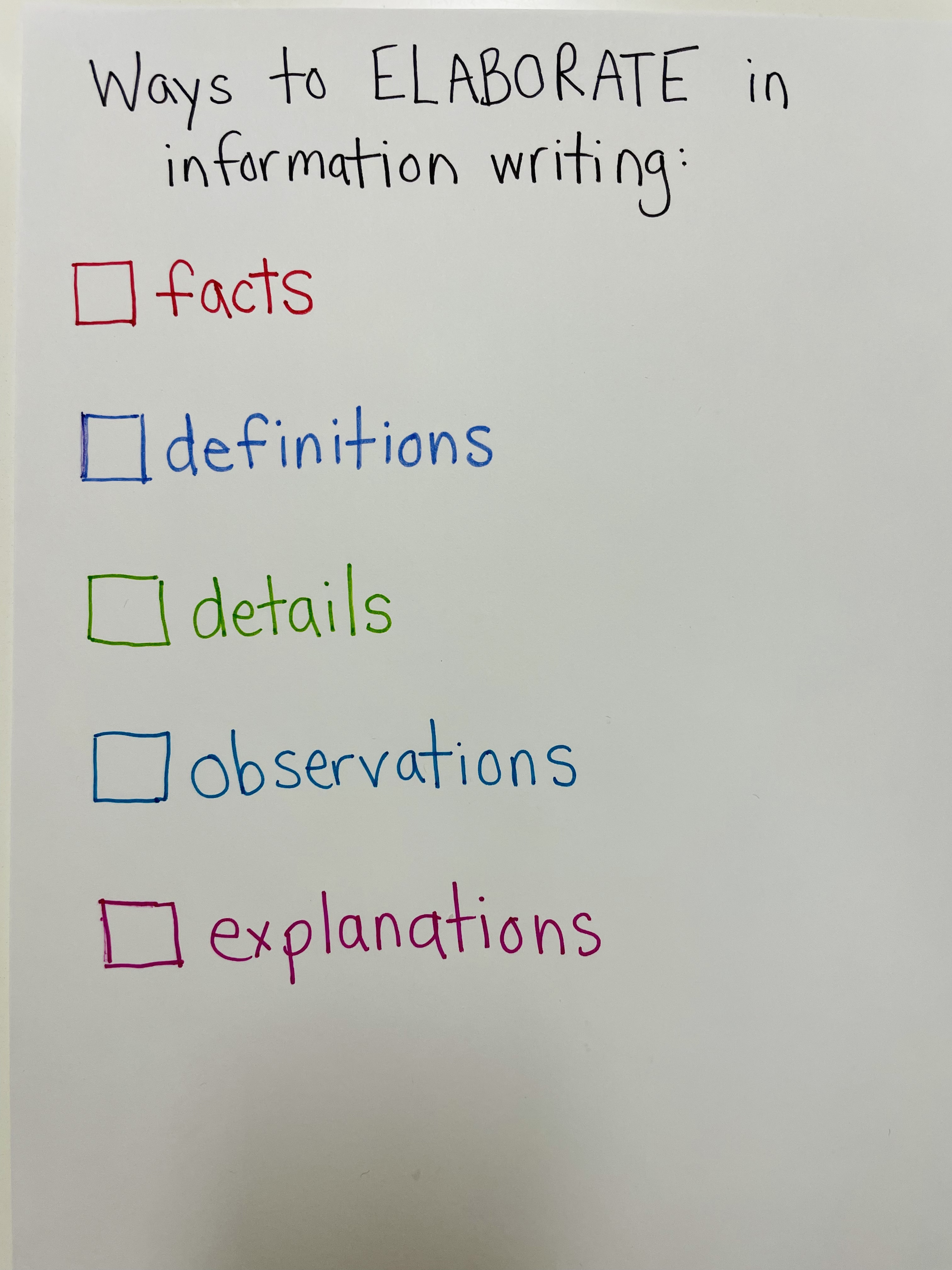 This means that at any given time, there will be unfinished charts on display. I might have a chart that lists ways to add detail, but it only has one strategy listed on it for now. I might have a chart that mirrors the students’ writing checklist, but only the structure part is revealed, with the rest to come later.