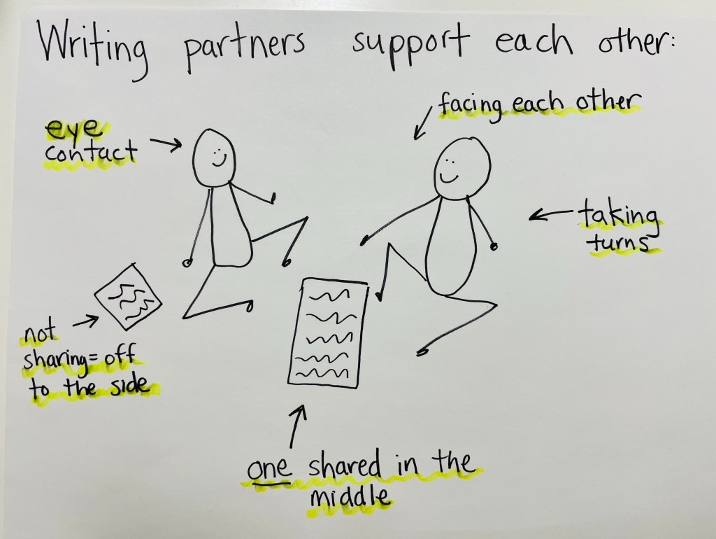 There might be times when it’s necessary to prepare an entire chart ahead of time, but I’ve found that to be the exception. Generally, I prefer to create charts a little bit at a time, together with kids. This typically takes place throughout the writing workshop. Sometimes, as the final part of my minilesson, I’ll add a bit to our checklist. Other times, I’ll do this work during the share/closing at the end of the workshop. Occasionally, I’ll add to a chart in the middle of the writing workshop, as a part of a mid-workshop interruption. I’ll often invite students to draw or write for me (with a bit of coaching from me), so that kids own the charts as much as I do–and so that the chart is more memorable.