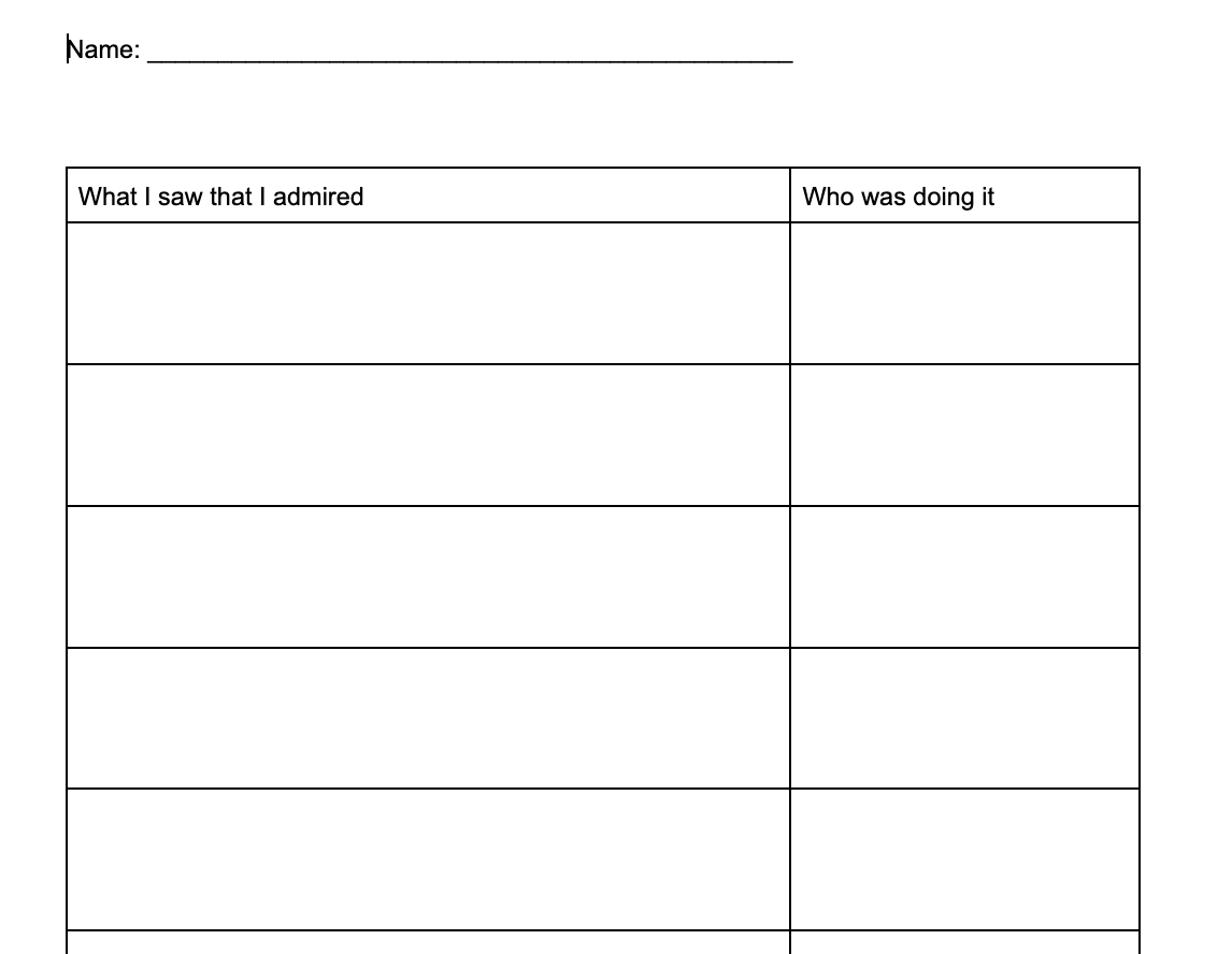 As they circulated, we also gave students “Goal Forms” that traveled with them. On these forms, they wrote what they say that they admired or wanted to try and where they saw it.