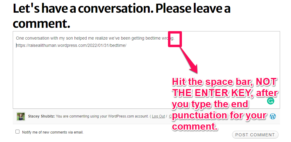 Every blog post you publish will have a unique URL, which we refer to as a permalink. Please share daily with your permalink, rather than leaving a link to your blog. To find this link: click on the title of your blog post. The permalink will appear in your browser. Copy that entire link so you can paste it into your comment when you leave a link to your slice of life story on Two Writing Teachers.