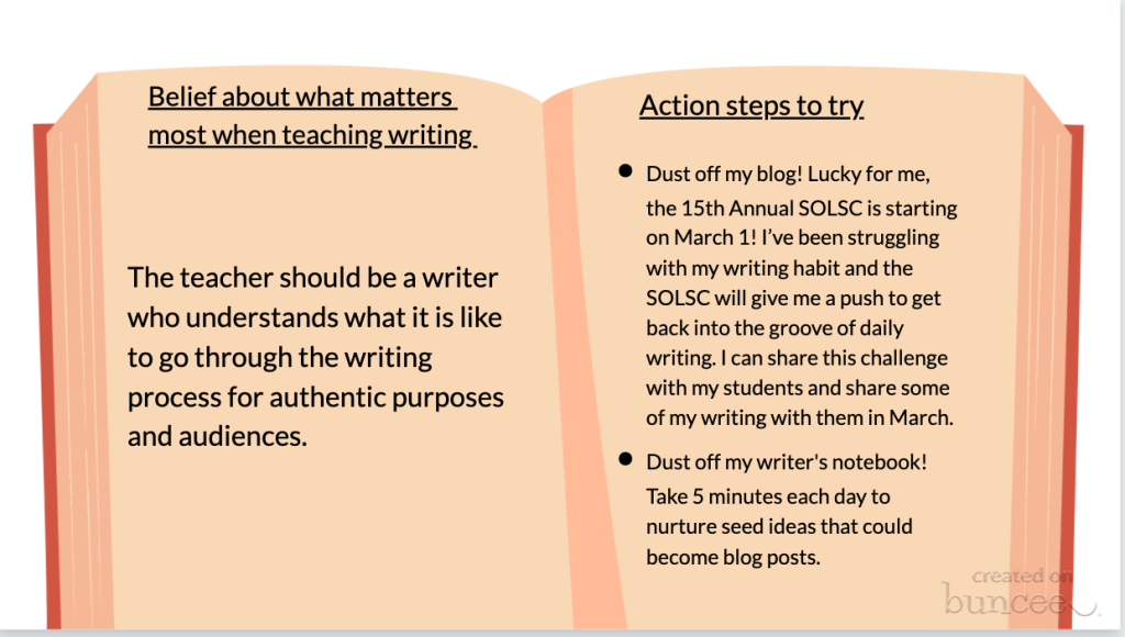 Focusing on all the reasons why teaching writing feels hard and feeling badly about myself for not being the writing teacher I want to be is ultimately energy wasted. Identifying what I believe matters most and then coming up with a plan to do SOMETHING towards those goals make me feel that I am moving in the right direction.