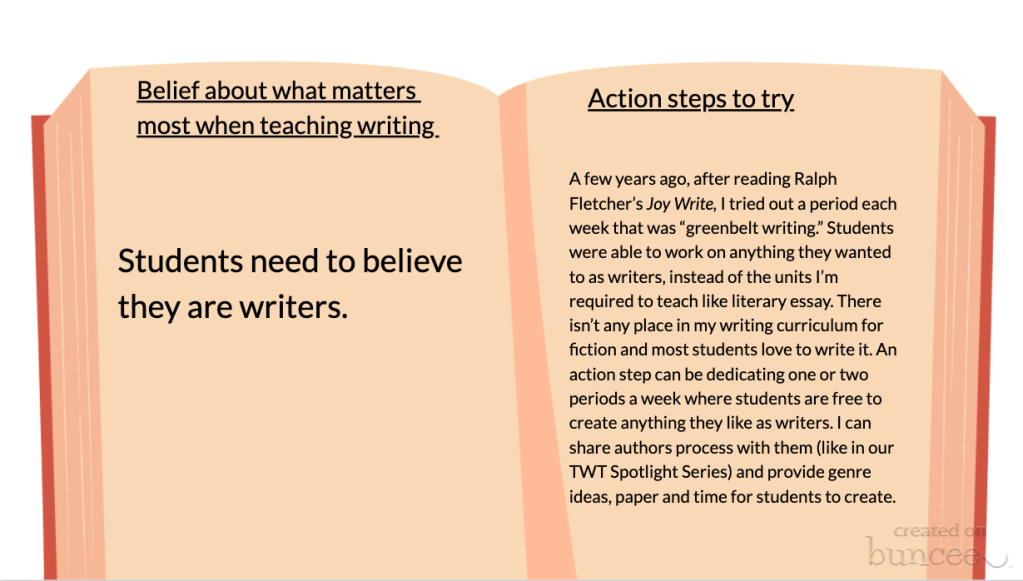 Do your beliefs about what matters most when teaching writing align with your current practices? What is one small step you can take for alignment and progress?