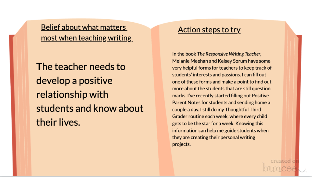 Why is there a gap between my beliefs and my practices? Ah, Elizabeth Benton would say not to give energy to the problem- to put more energy into finding solutions. But…briefly, it feels like teaching writing the way I know it needs to be taught takes more time than I have. With 23 students and every subject to teach, reading and math get most of my focus. With several reading groups to plan for and with math involving concept development, fact fluency, and problem solving, most of my instructional planning goes there. Writing also feels like an uphill battle this year. Several students did not attend school in person for over a year and a half and writing literary essays (my current curricular expectation) feels impossible when some students struggle to understand texts and to compose a simple paragraph.