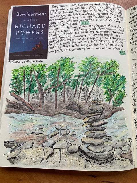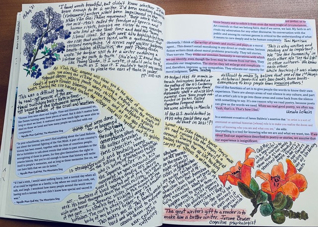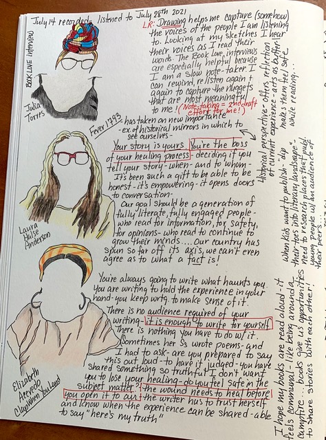 There is no one way. Linda Rief, one of my longtime mentors, elevates writing about reading to an art. I covet her beautiful notebook captures, which she sometimes shares on Twitter or with me via email after we read the same book. She draws and doodles, sometimes prints little parts of text, and captures her thinking in a variety of ways – not just after reading but after hearing a podcast or keynote. I include a variety of examples from her notebooks below.