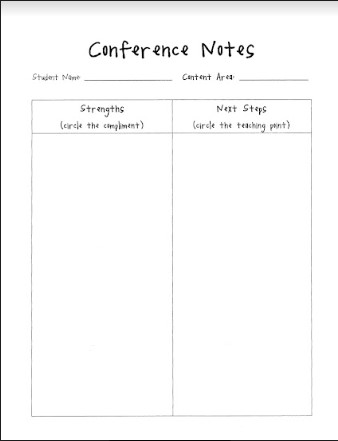 This simple t-chart is a great place to keep individual records on a student. I like to start a new t-chart for each unit of study, first adding strengths and next steps when looking at initial drafts or on-demand pieces. This document can then become a record of conferences and small groups. When I sit down to confer with a child, I often circle something I have noted on the Next Steps column to teach into. After meeting with a child, I add the date and a quick note about our work together. On-the-spot noticings can also be jotted down as possible next steps for another time.