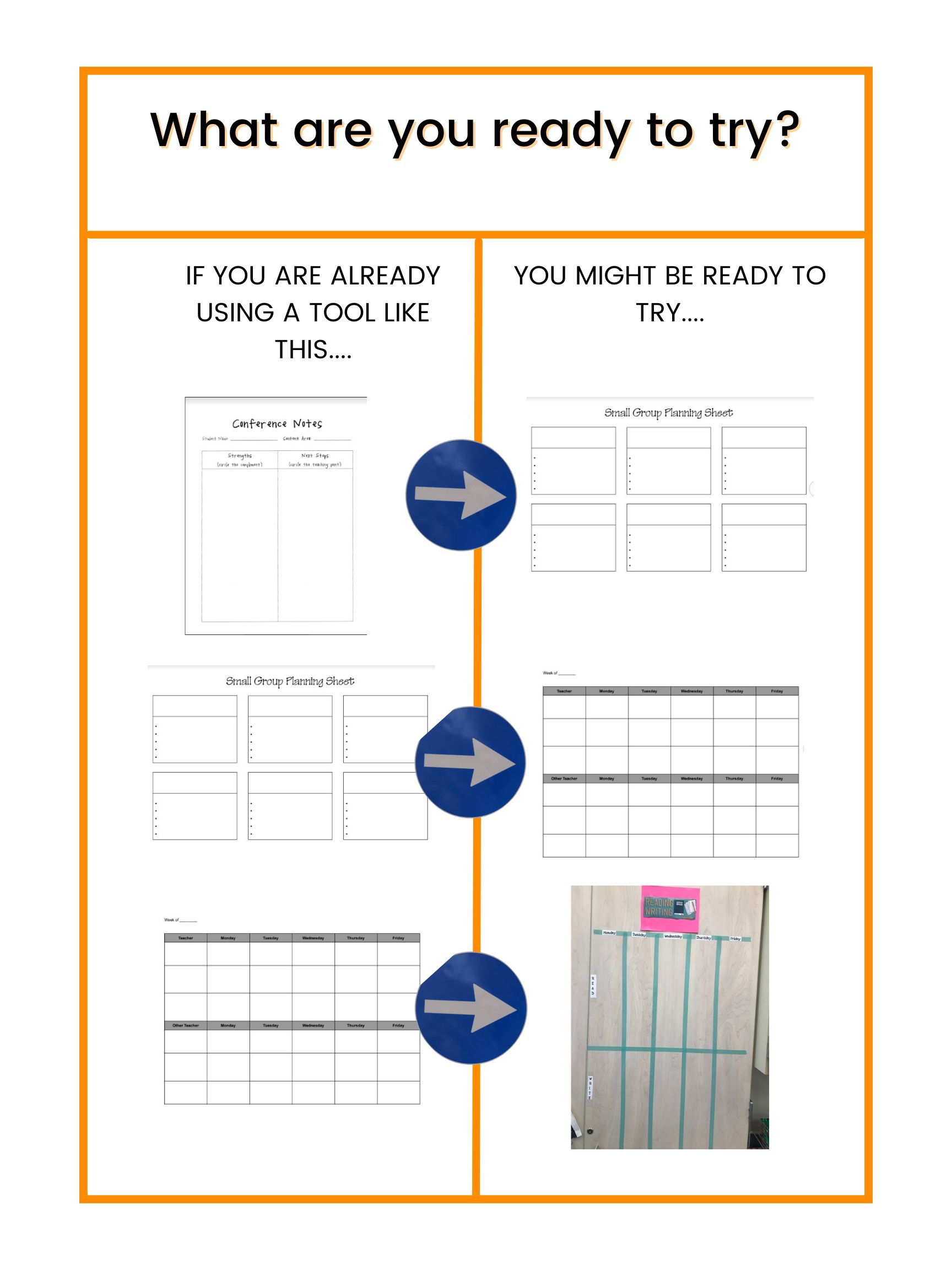 I don’t recommend printing out all of these tools and trying to put them into place all at once. Instead, think about where your current planning practices fall. Are you the kind of teacher that is already taking individual conferring notes? Your next step may be looking for patterns or trends among the students in your class. Do you have your students organized into similar needs but find that you can’t make time to get to everyone? Then, you might be ready to try making a plan to get to more groups across your week.
