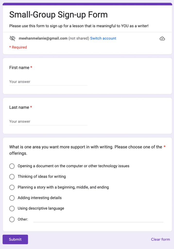 Google forms is one way to invite students into the goal-setting process. You can customize them with the names of students in your classroom and what they could be working on.