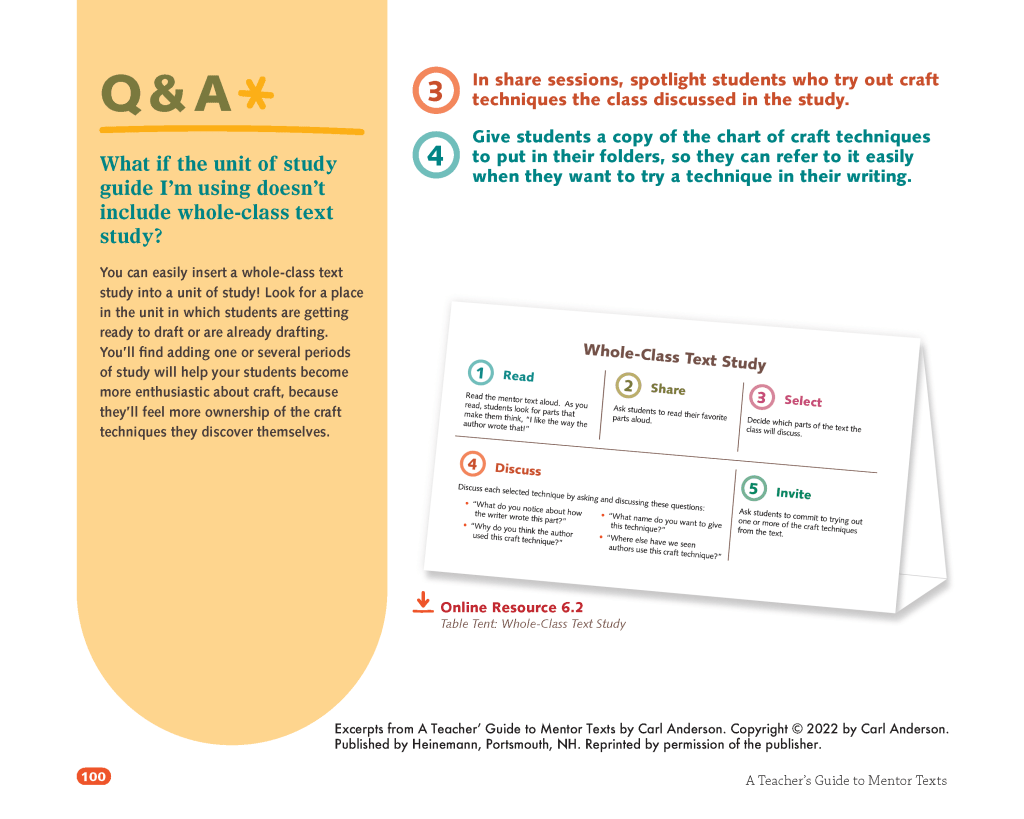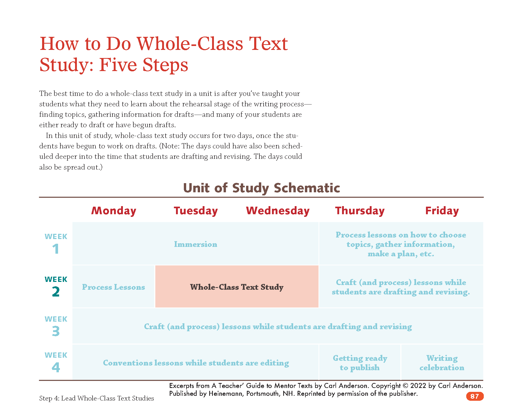 You won’t teach a typical writing workshop format (i.e., minilesson, independent writing time with conferring and small group work, share/reflection) on the days you set aside for whole-class text study. Rather, you’ll set aside anywhere from 15 minutes to a whole class period to study a text deeply with your students. (There are two videos in chapter six, which feature Carl engaging both primary and upper-grade students in whole-class text studies.) Any time left over at the end provides students with time to write independently.