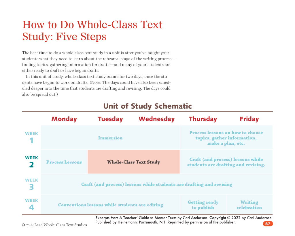 The steps for leading a whole-class text study can be seen on page 100 of Anderson’s book: