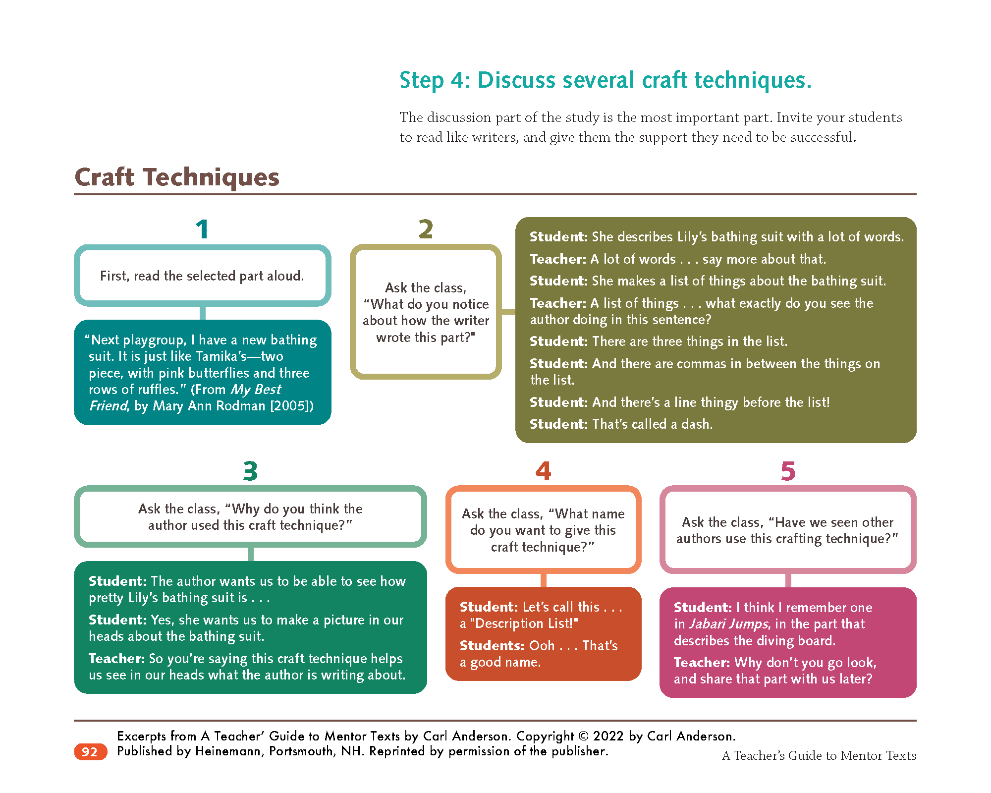 Just as we talked about the fundamentals of mentor texts on the pod, Carl Anderson’s new book, A Teacher’s Guide to Mentor Texts, Grades K-5, is the primer educators need if they’re new to working with mentor texts in writing workshop. Throughout the approximately 100-page book, Carl lays the foundation for this work by explaining what a mentor text is and what reading like a writer means. Once there’s a shared fundamental understanding of these terms, Carl showcases five steps to help teachers use mentor texts meaningfully with elementary students. Those steps are: