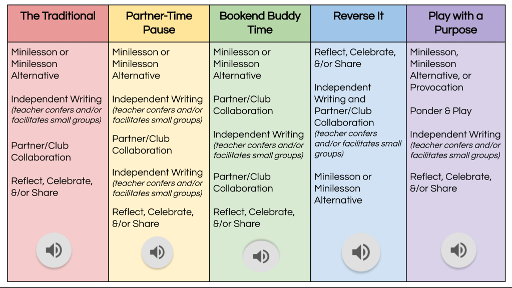 Workshop is inherently flexible. Remember that the true heart of writing workshop is the extended time and space students have to make choices, plan, create, reread, and revise- and the more responsive, individualized instruction the teacher provides while students are actively pursuing their personal writing goals. Each of the above options protects that time, but in ways that feel right for class members. Articulating a clear “why” and then making intentional, student-centered decisions that enact that vision is one more way we commit to providing asset-based, responsive writing instruction. What other kinds of structures have you tried or might you consider with this pursuit in mind?