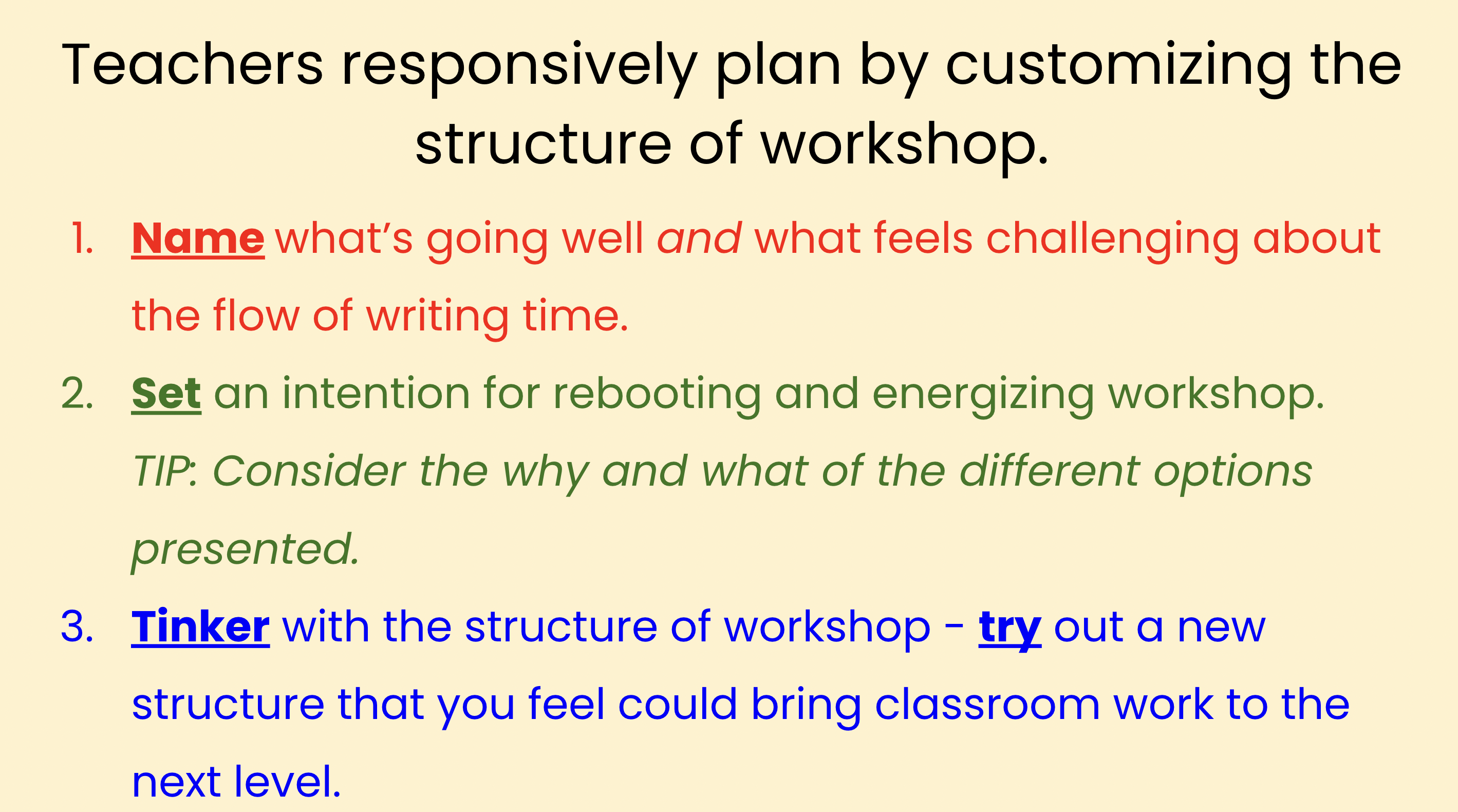 Workshop is inherently flexible. Remember that the true heart of writing workshop is the extended time and space students have to make choices, plan, create, reread, and revise- and the more responsive, individualized instruction the teacher provides while students are actively pursuing their personal writing goals. Each of the above options protects that time, but in ways that feel right for class members. Articulating a clear “why” and then making intentional, student-centered decisions that enact that vision is one more way we commit to providing asset-based, responsive writing instruction. What other kinds of structures have you tried or might you consider with this pursuit in mind?