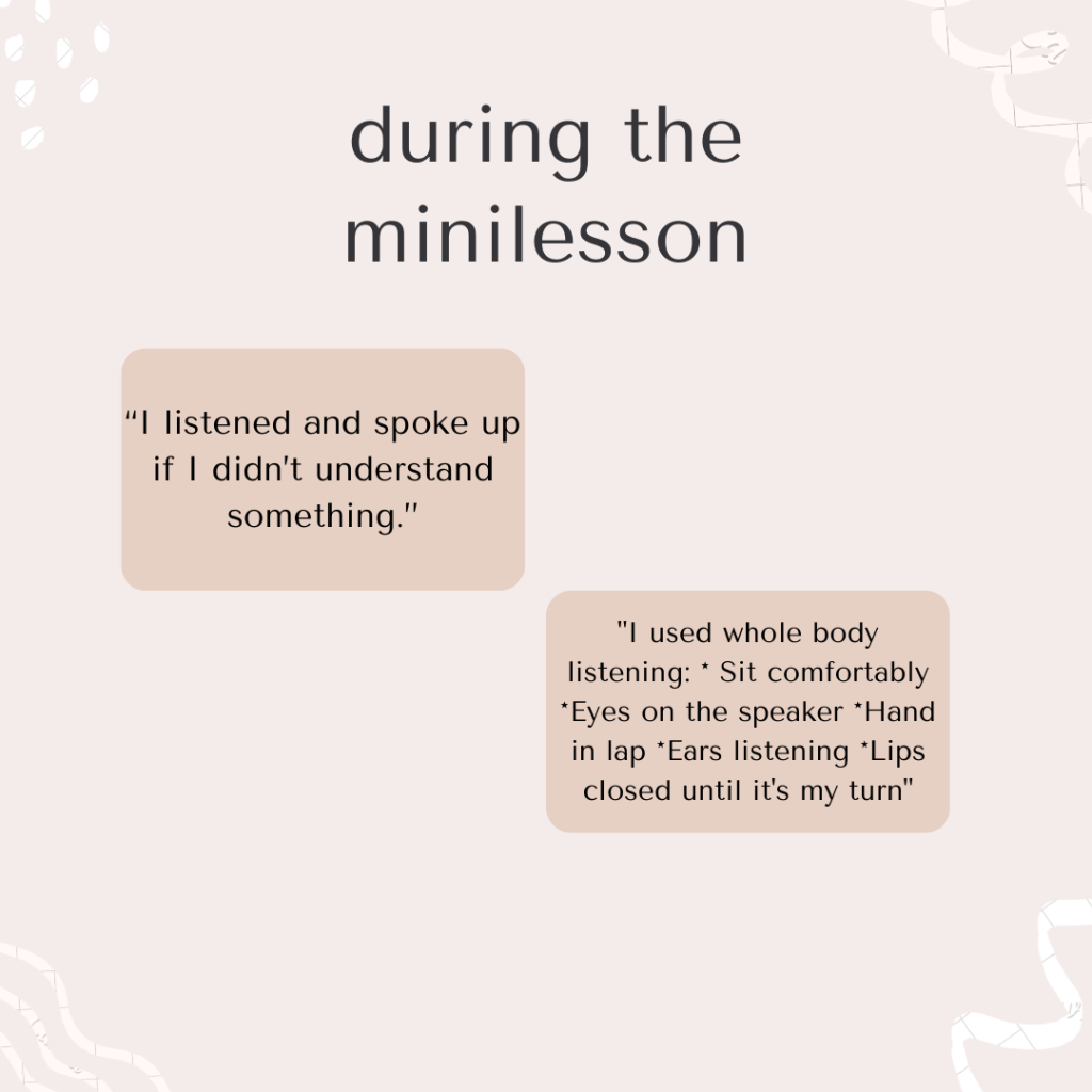 You might also generate questions based on the minilesson you taught that day, or how they feel about the plans you have for the next day’s minilesson.