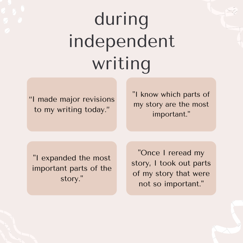 - Student-created checklists of what to look for in their writing (based on teacher-created checklists and anchor charts)