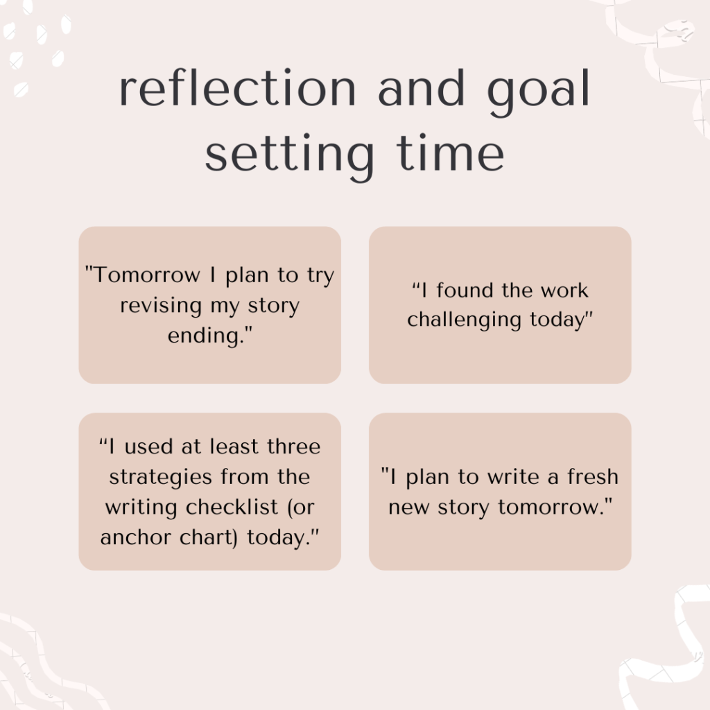 My own current writing workshop goal? To make sure to leave five or ten minutes every time I’m teaching writing for the reflecting and goal setting time!