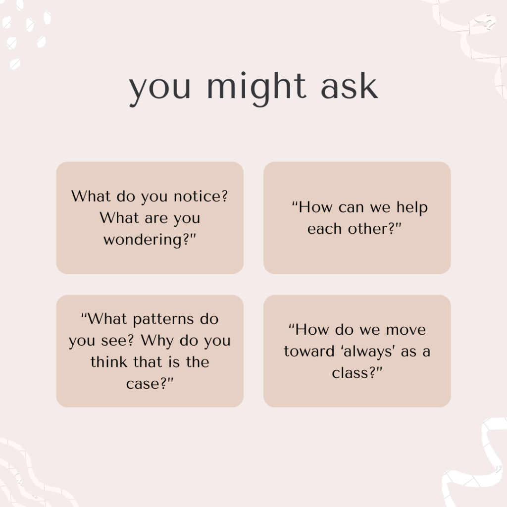 After time has been spent building a safe and supportive community, and students are ready for whole class reflections, I pose a question or a prompt generated from my observations and notes.