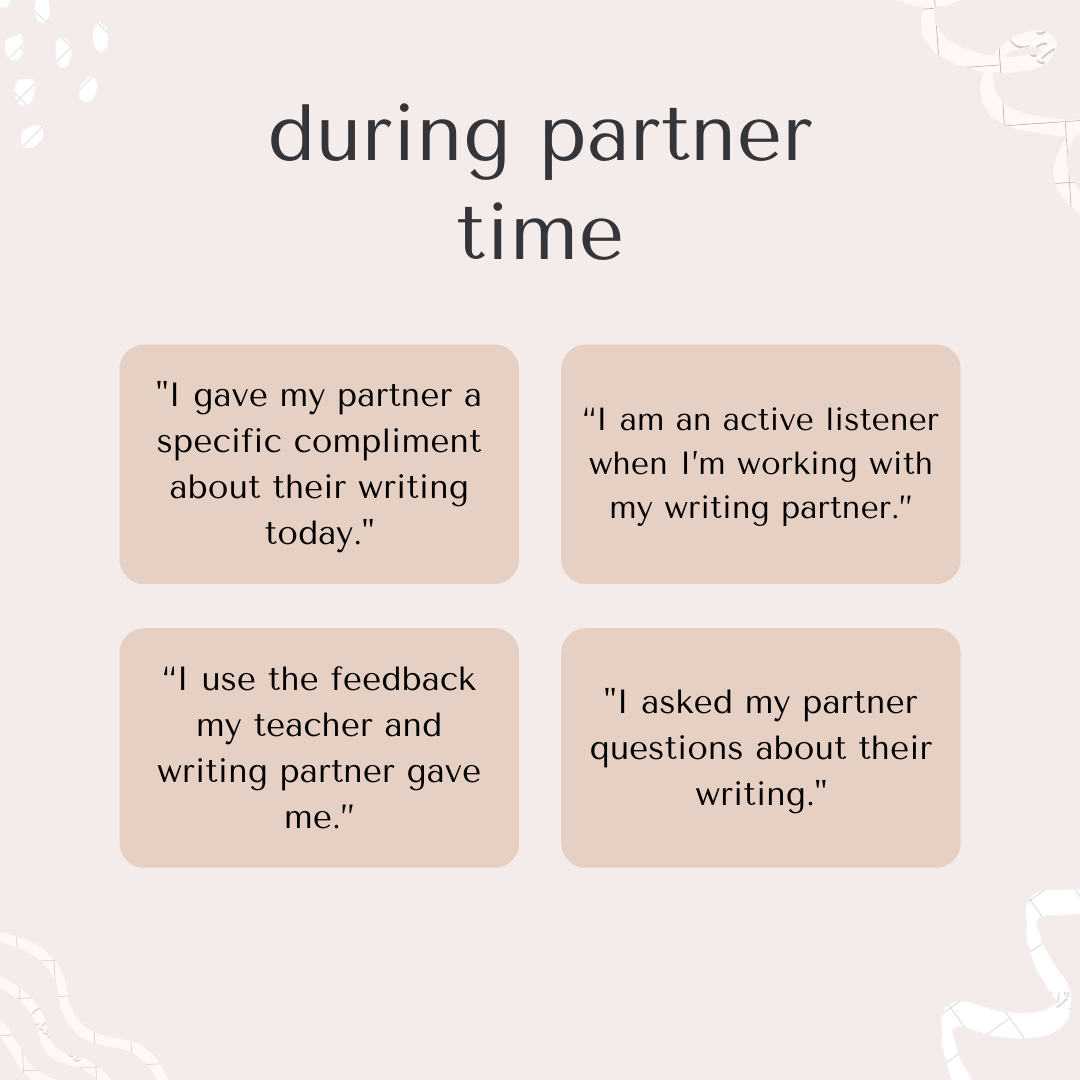 Strong partner work is taught explicitly – in minilessons, partner conferences, general coach and reminders — and lots of modeling. Writing partners are key to teaching students one of the most important parts of writing – having an audience. Additionally, partner work provides a context for the other most important parts of classroom work that cut across all content areas, and life: developing relationships, listening and speaking effectively, and executive functioning (working memory, flexible thinking, self-regulation).