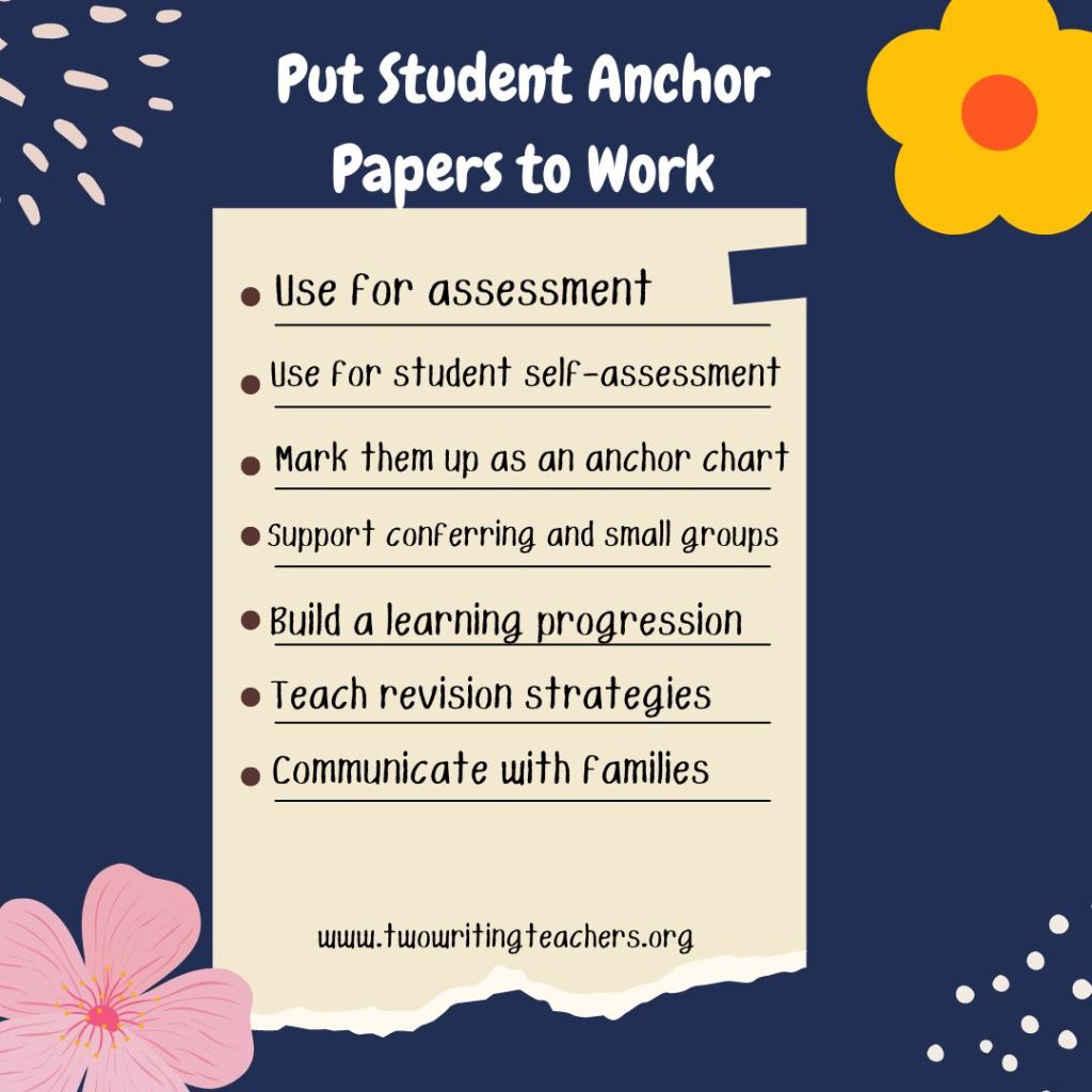 - Provide students with a few anchor papers, not just one. One of the most important things we try to teach developing writers is that each writer has a unique voice and style. Anchor papers should provide examples, not the “one right way” to do something.