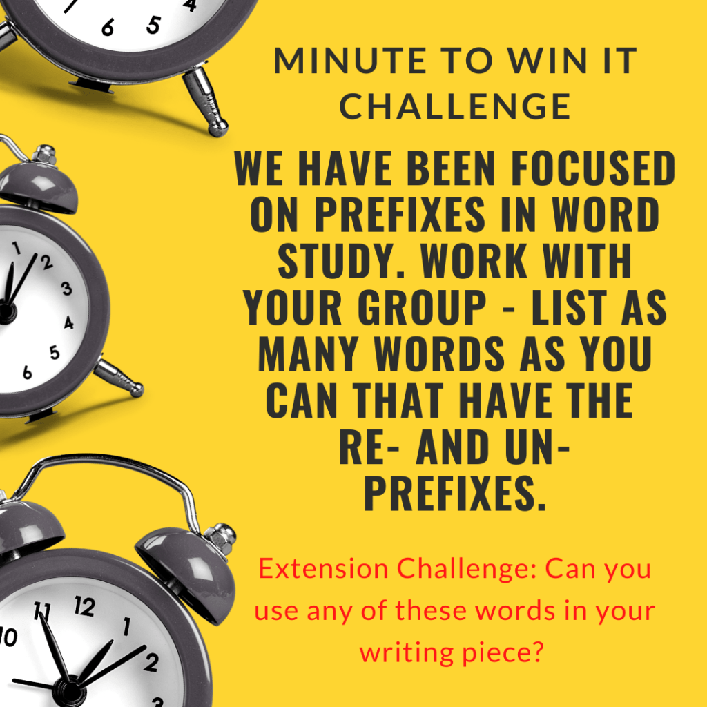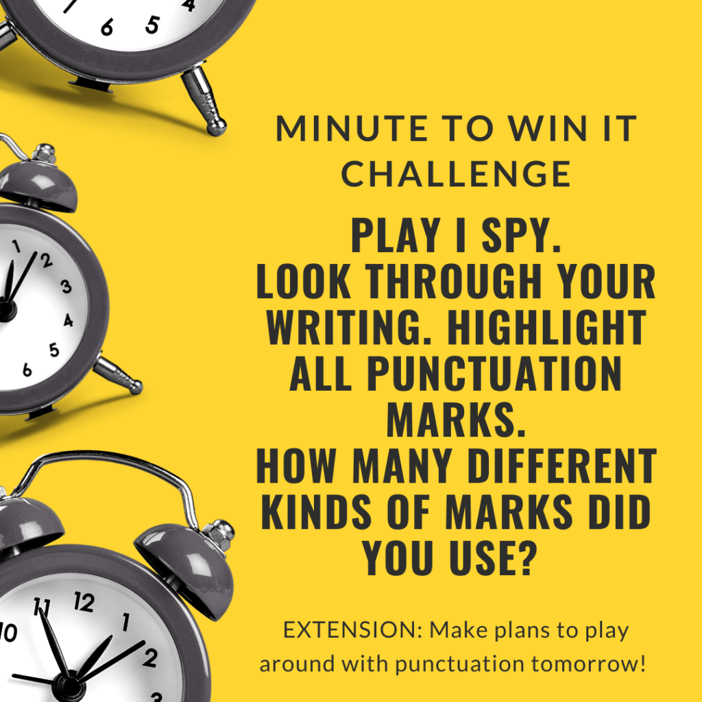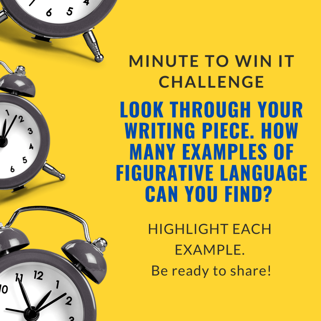 Who doesn’t have a minute? This lesson closure is a playful way to spice up a session of workshop or encourage students to try less-used strategies. Essentially, you pose a small challenge and everyone in the class has a minute (or a little more- they will be working, not watching the clock) to accept your dare. Here are a few examples of minute-to-win-it writing challenges: