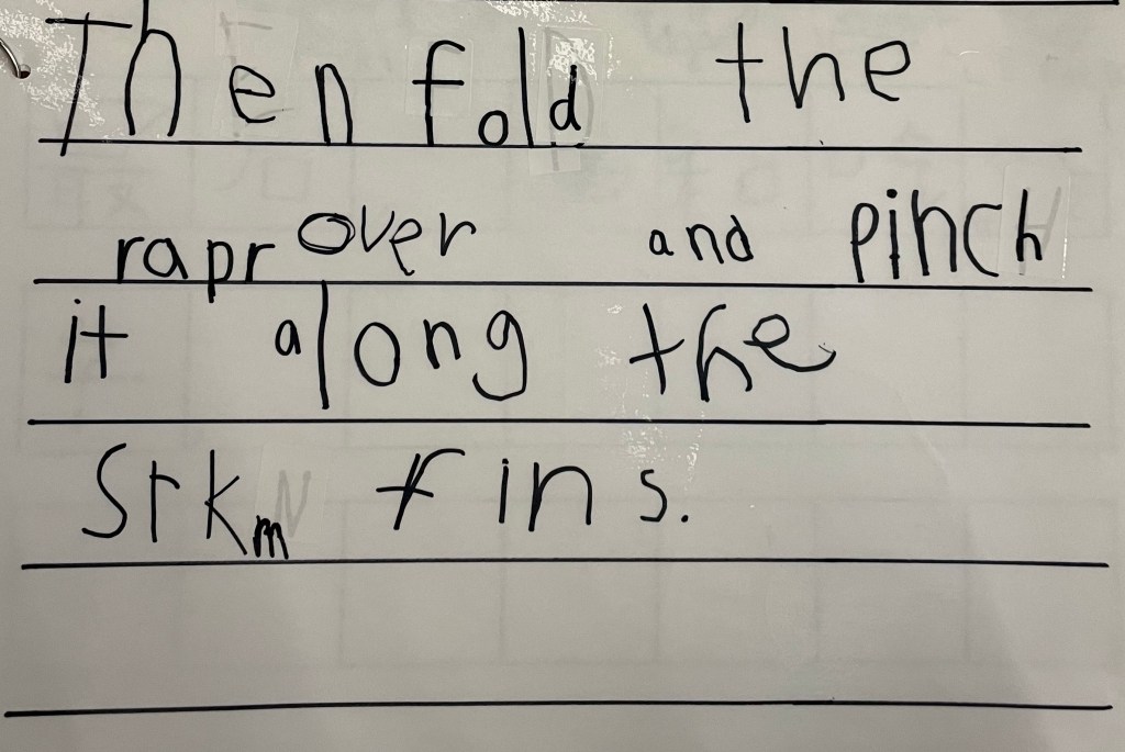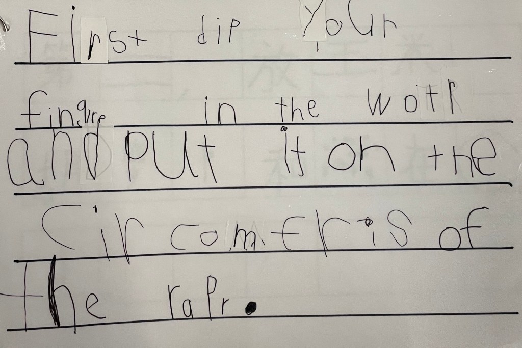 The rest of the process followed along the lines that much interactive writing does. The children helped compose the text, the pen was shared between individual students and the teacher, care was taken to correctly spell high frequency and other phonetically predictable words (in English), and we worked on basic writing conventions such as using appropriate capitalization, spacing, and end punctuation.