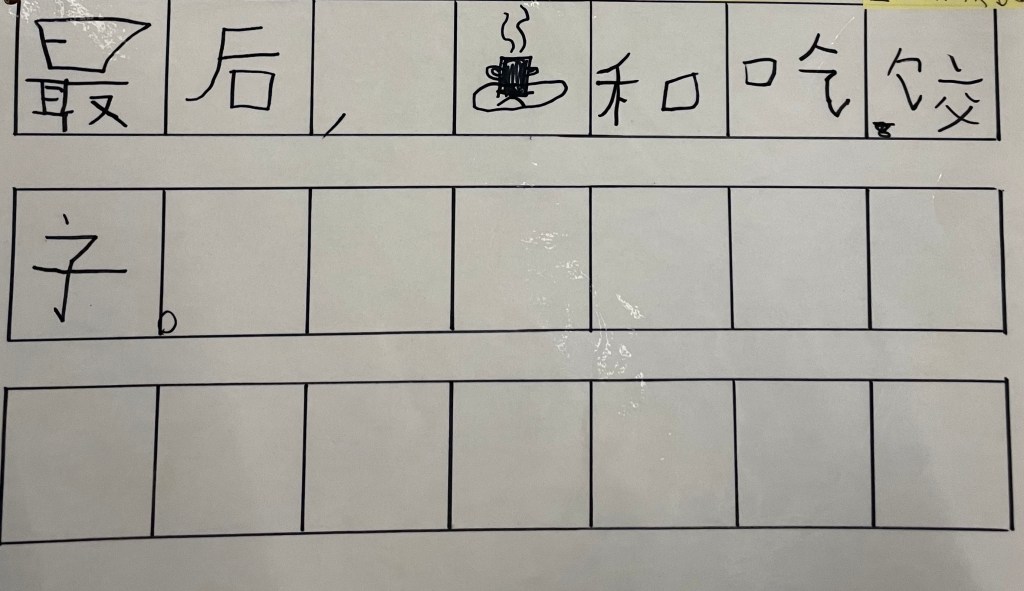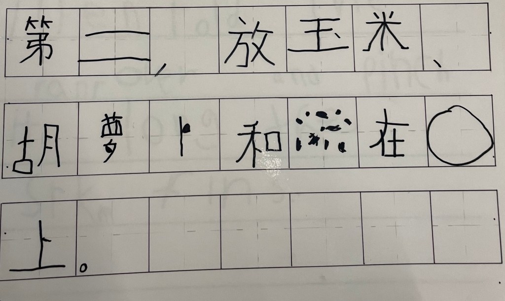 For the pages written in Mandarin, the children composed the sentences orally and wrote the characters using a combination of key vocabulary and high frequency word flashcards. In some cases, drawings were used in place of particular characters as a strategy to help children write words that they were not yet familiar with or could not yet identify.