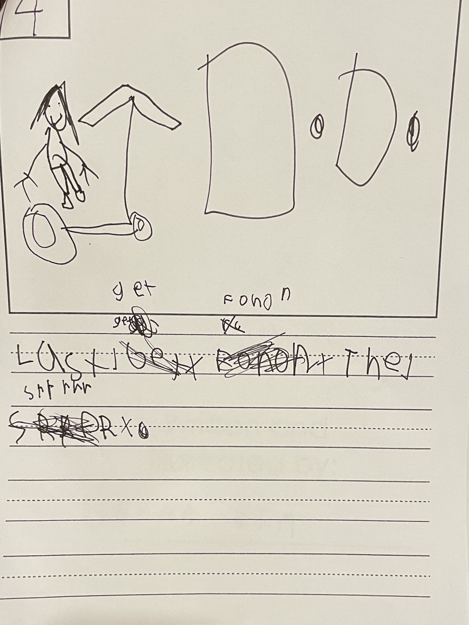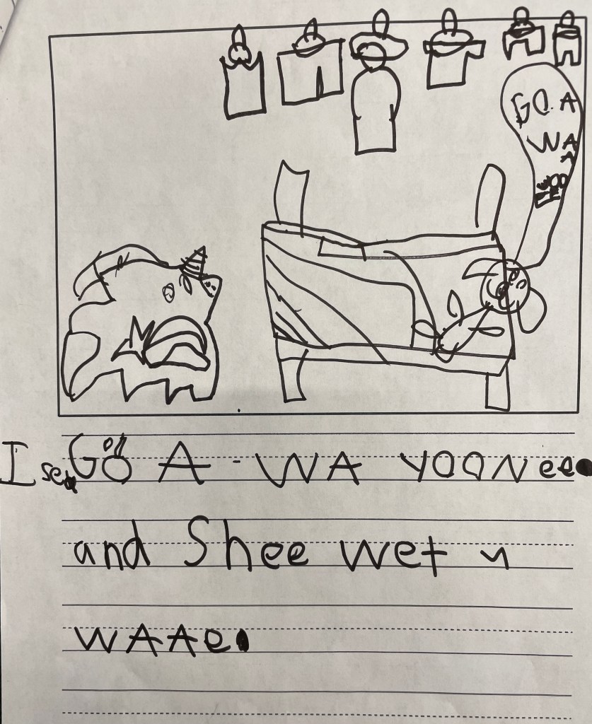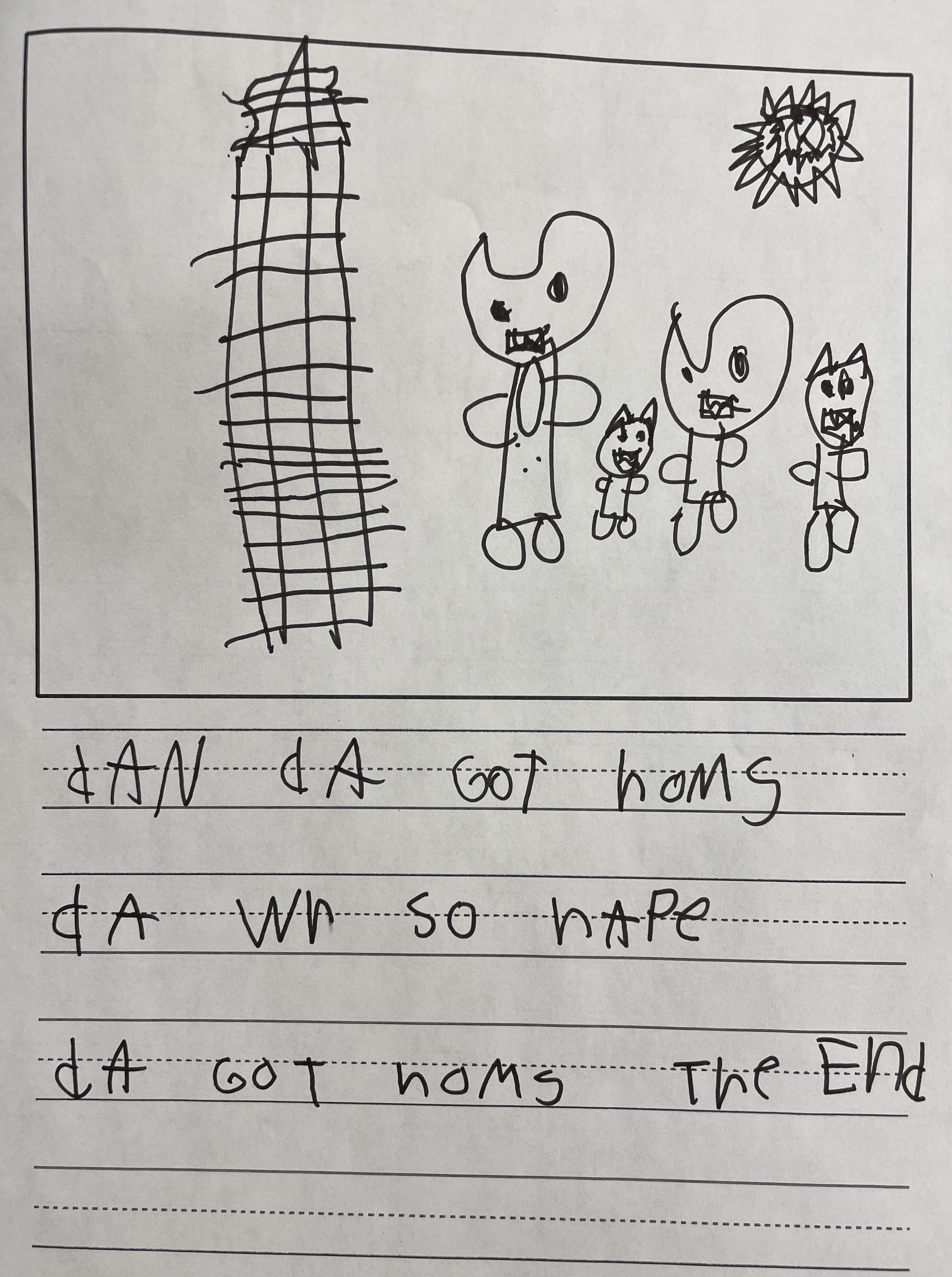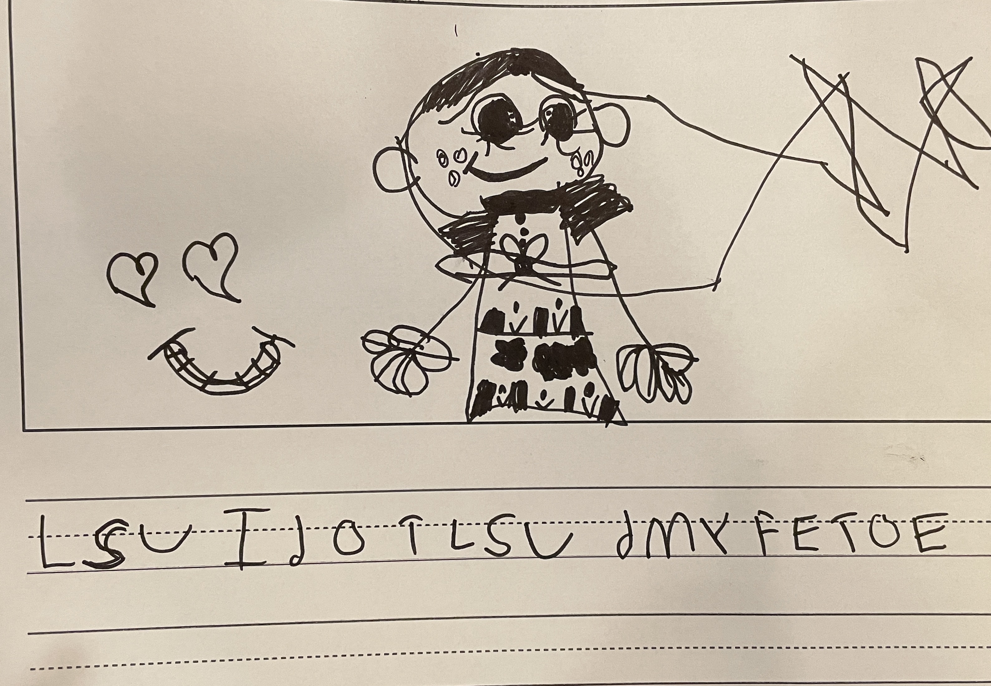 I usually begin with the illustrations because they are so compelling to me. Children’s drawings (especially when they are under the age of around ten or so–before they become too self-conscious), are magnificent. They are wiggly, uninhibited, masterful, and emotive. I love them. And so I start there. After I spend some time with the drawings, I move on to the letters and words. Sometimes they are clear and easy to read. Sometimes they are impossible. I do what I can and usually succeed in reading them, especially if I’ve had a chance to meet with the student and can recall what they intended to say.
