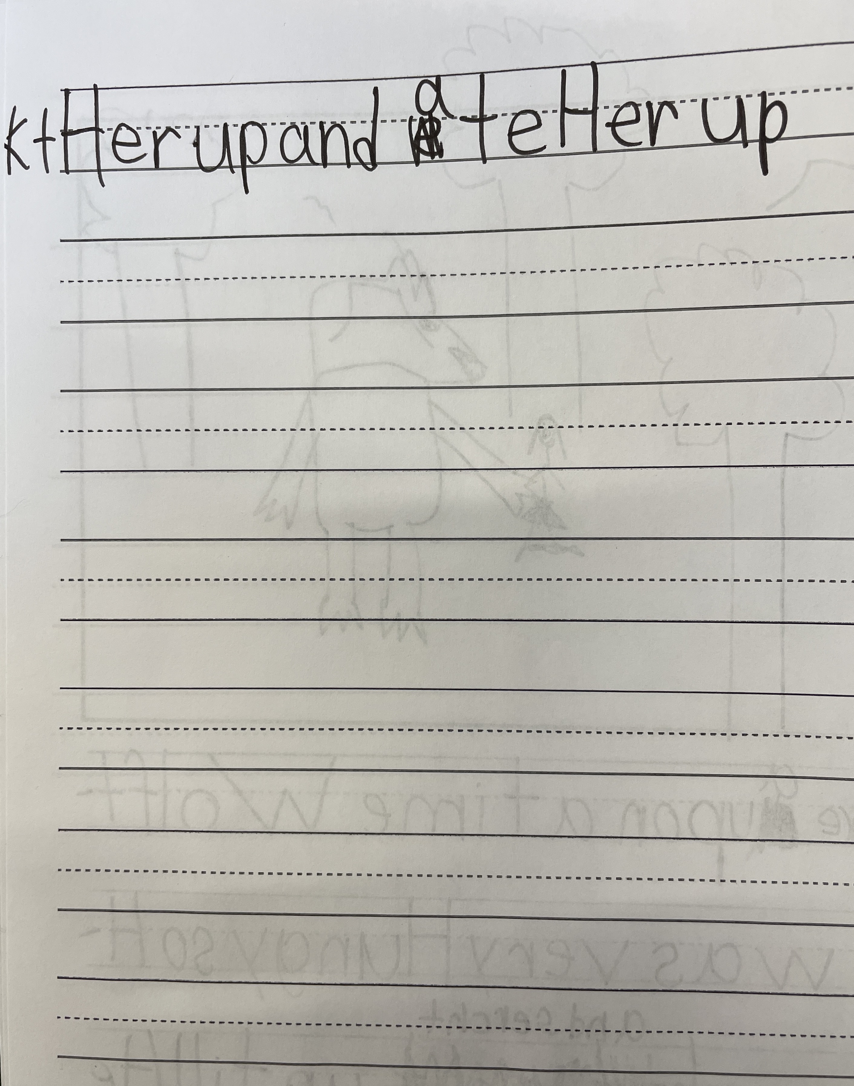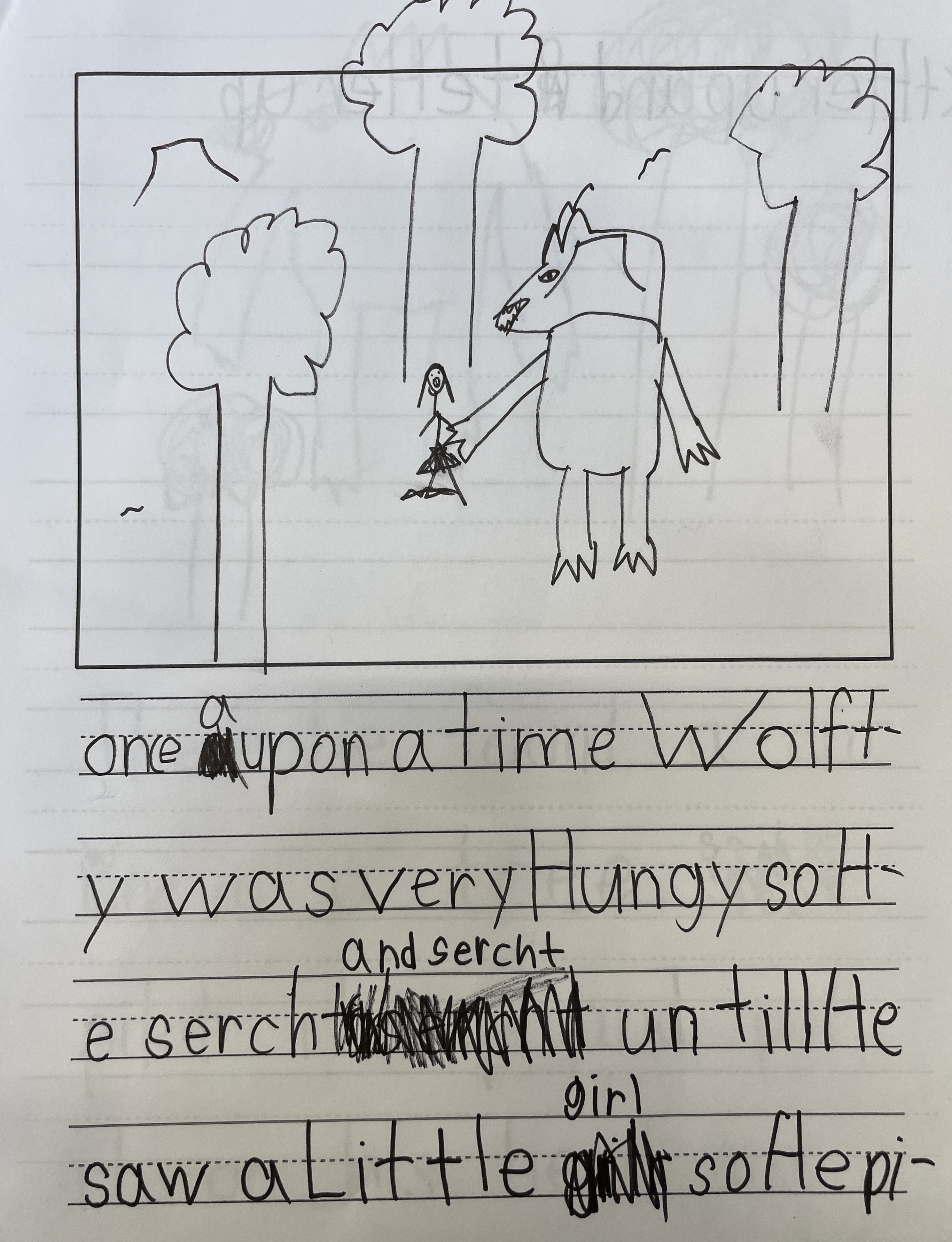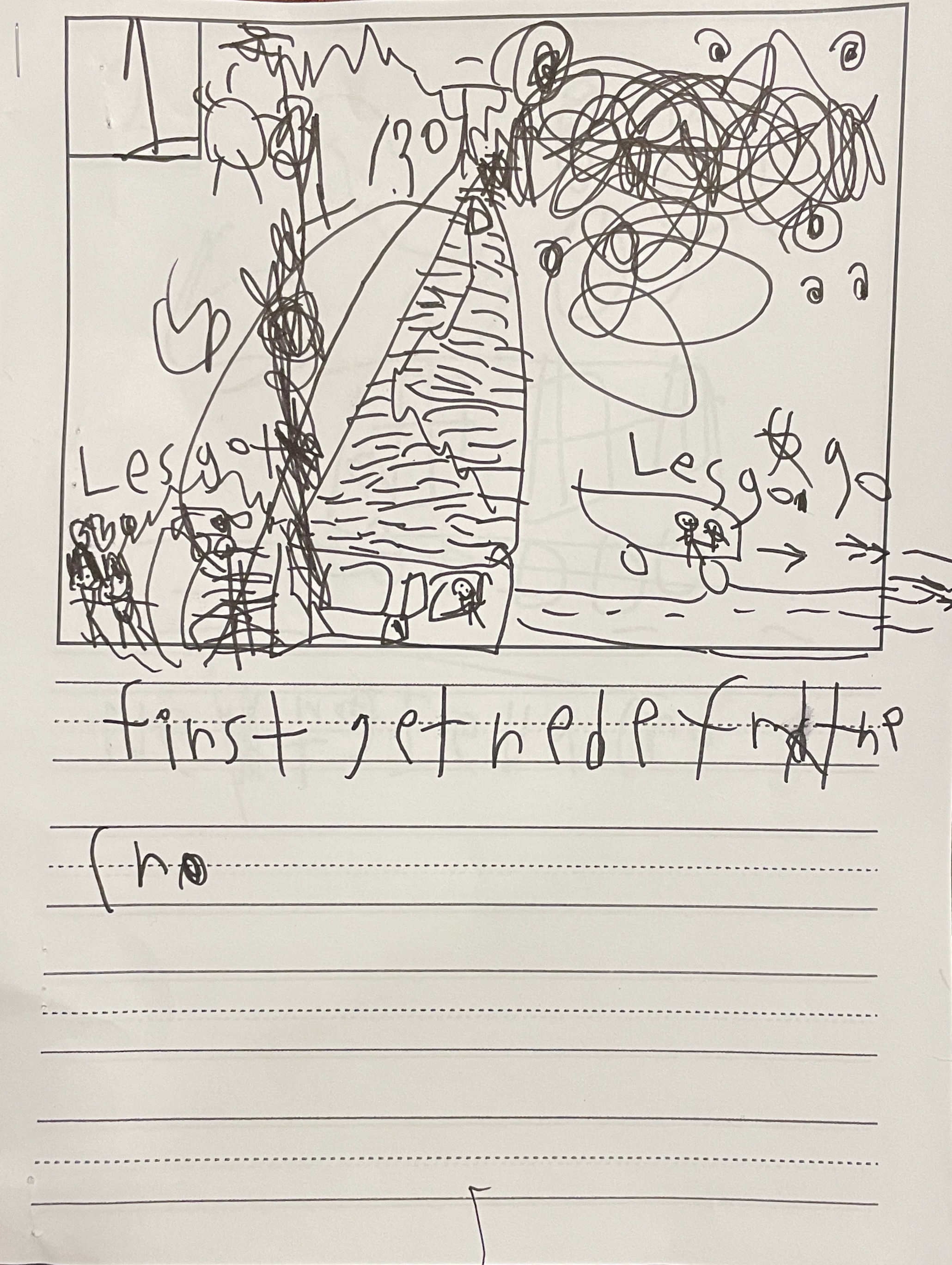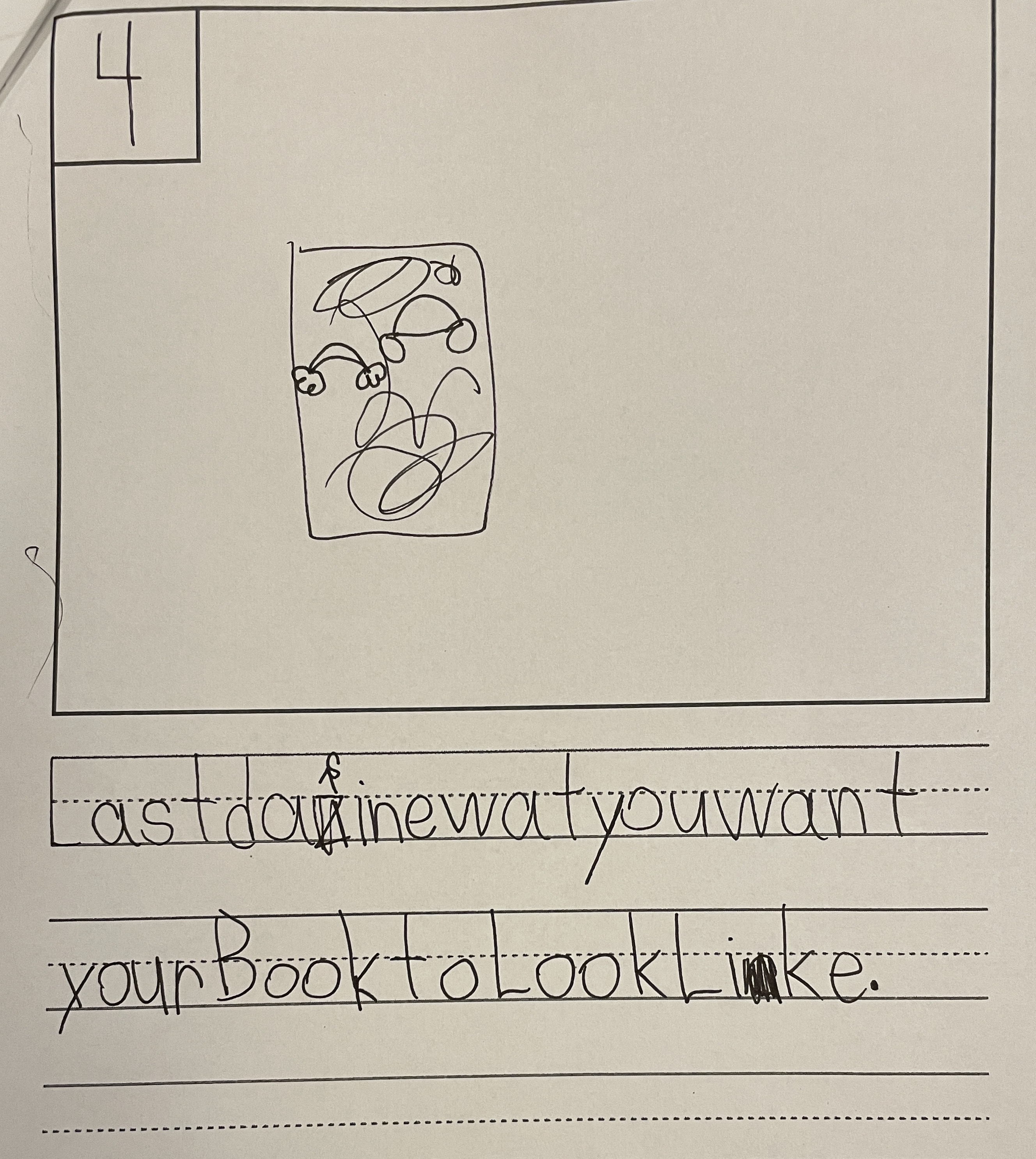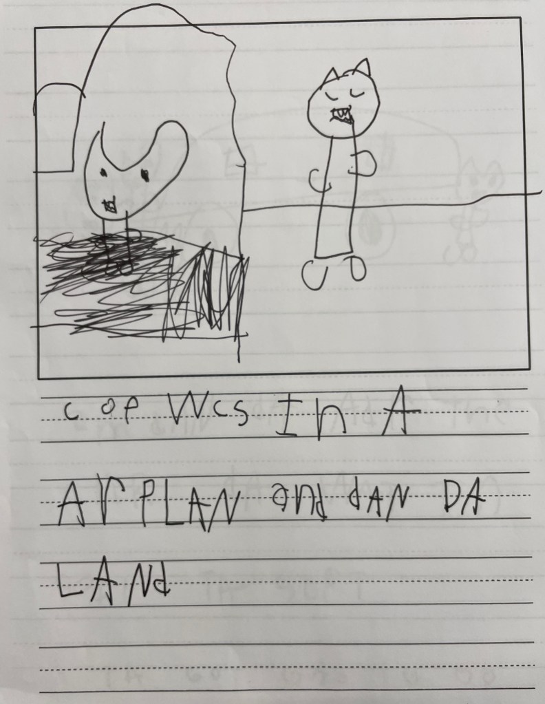 I usually begin with the illustrations because they are so compelling to me. Children’s drawings (especially when they are under the age of around ten or so–before they become too self-conscious), are magnificent. They are wiggly, uninhibited, masterful, and emotive. I love them. And so I start there. After I spend some time with the drawings, I move on to the letters and words. Sometimes they are clear and easy to read. Sometimes they are impossible. I do what I can and usually succeed in reading them, especially if I’ve had a chance to meet with the student and can recall what they intended to say.
