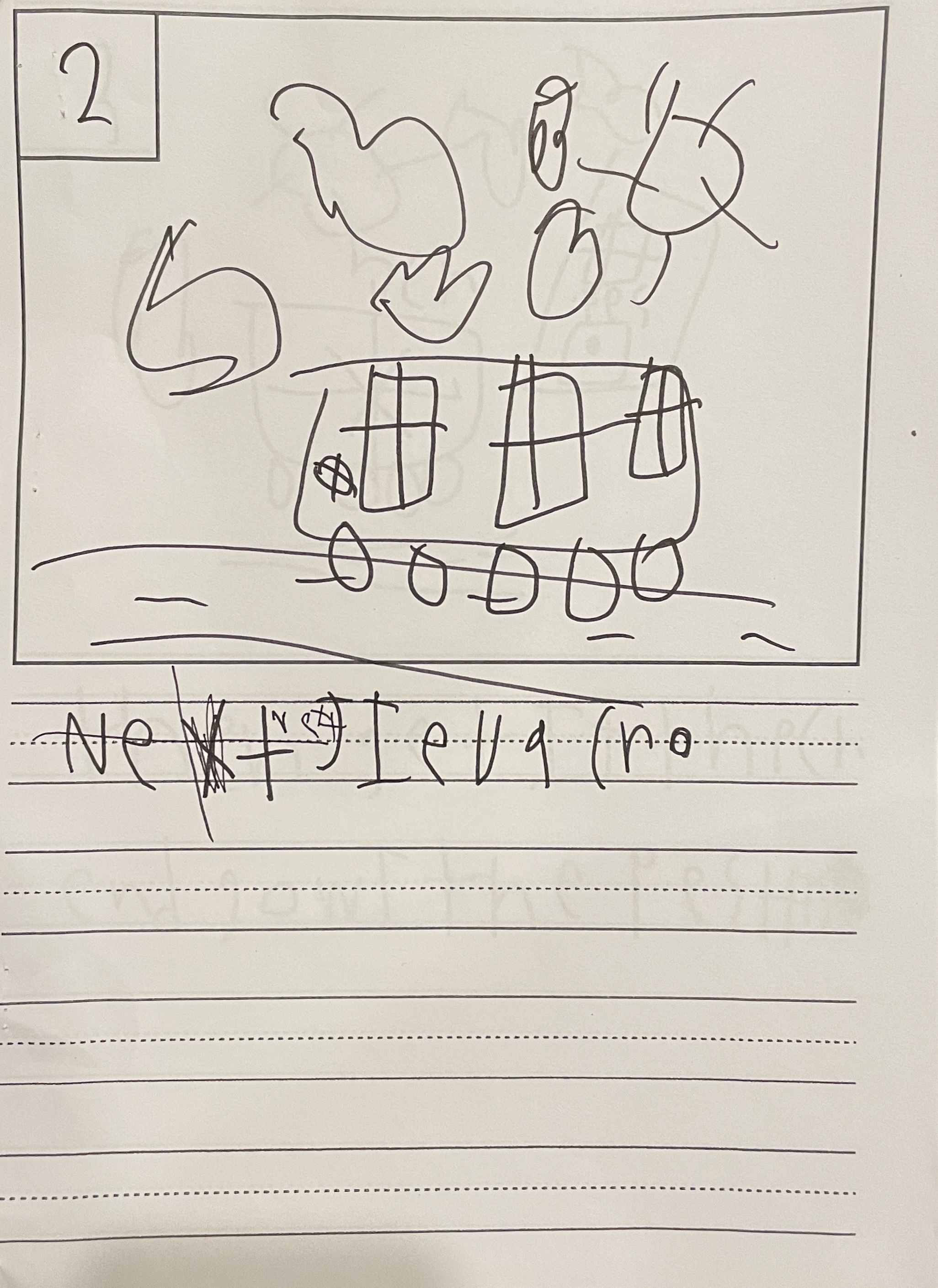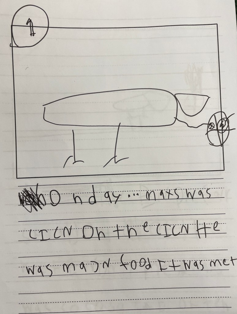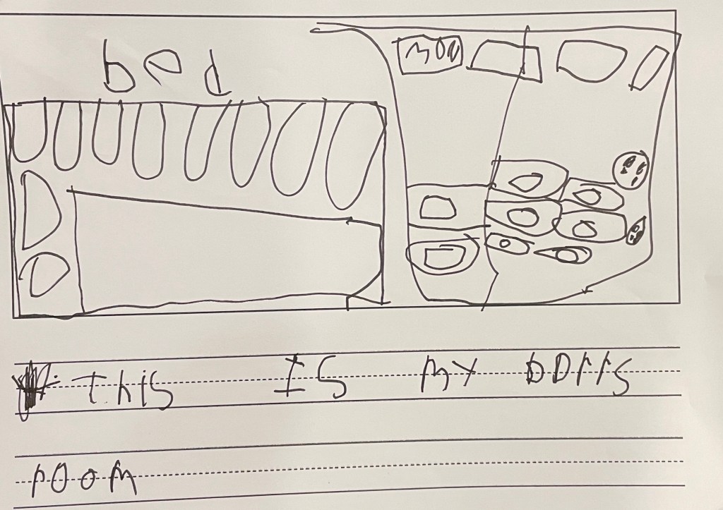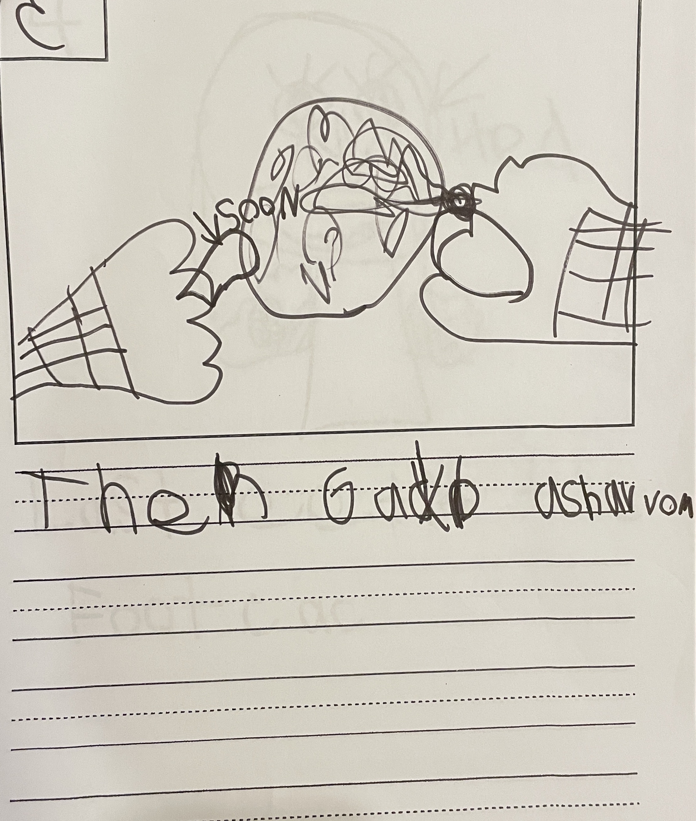 I usually begin with the illustrations because they are so compelling to me. Children’s drawings (especially when they are under the age of around ten or so–before they become too self-conscious), are magnificent. They are wiggly, uninhibited, masterful, and emotive. I love them. And so I start there. After I spend some time with the drawings, I move on to the letters and words. Sometimes they are clear and easy to read. Sometimes they are impossible. I do what I can and usually succeed in reading them, especially if I’ve had a chance to meet with the student and can recall what they intended to say.