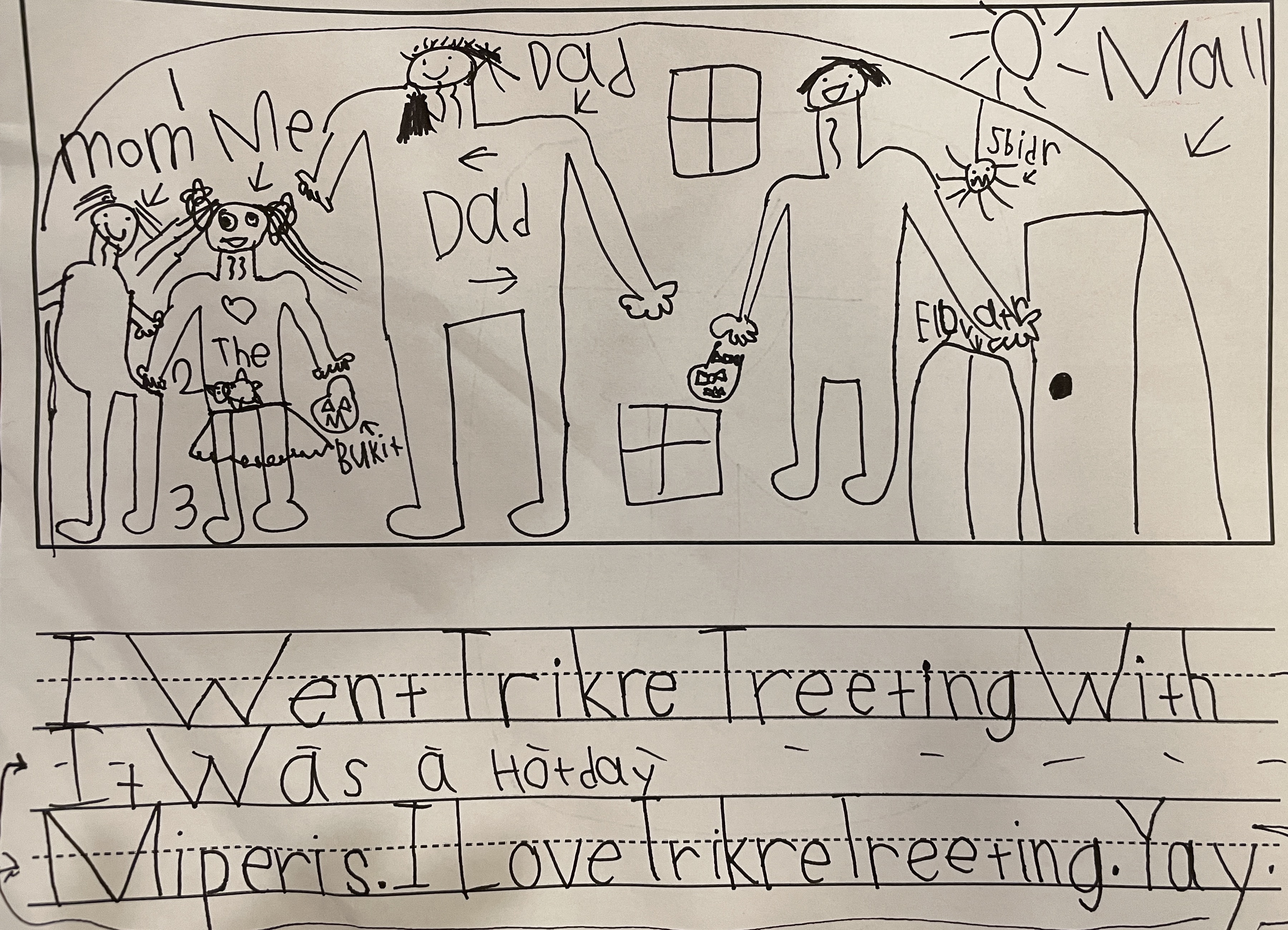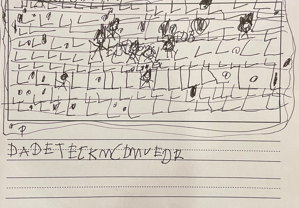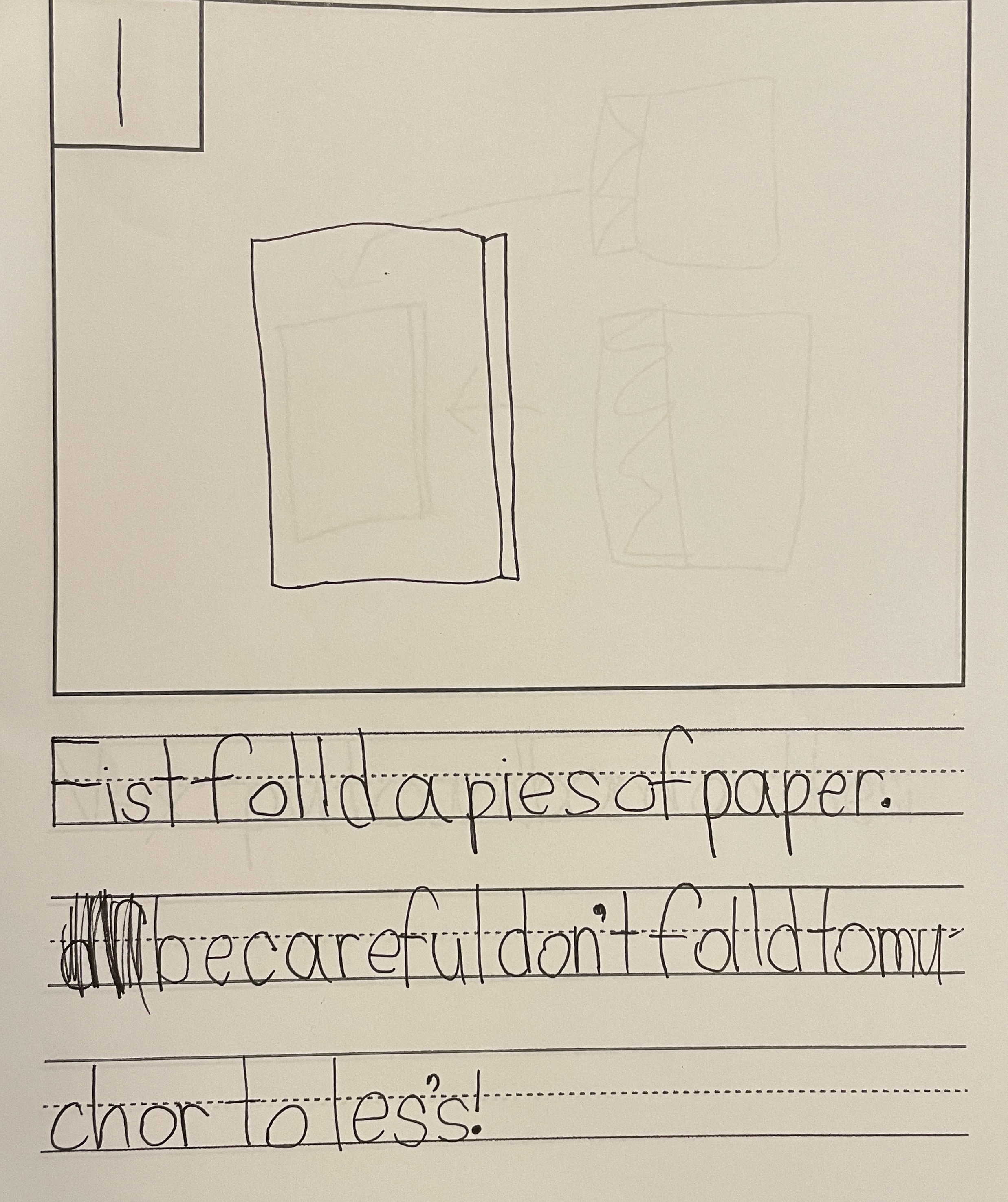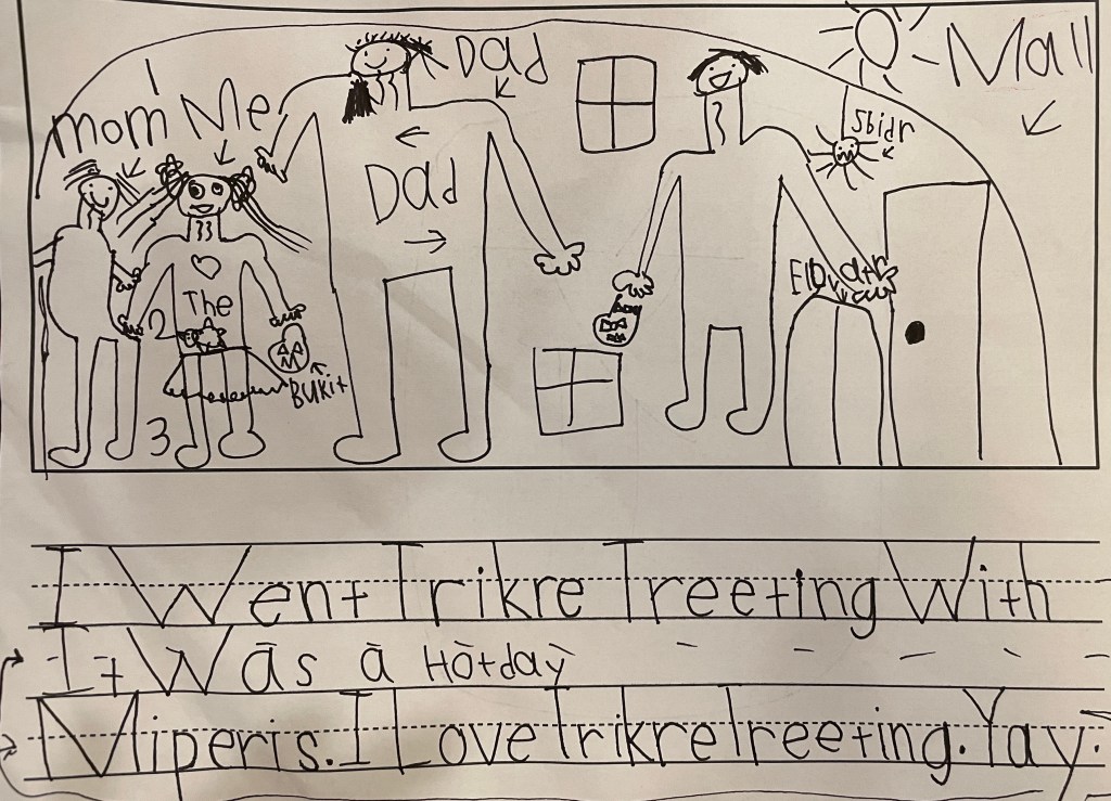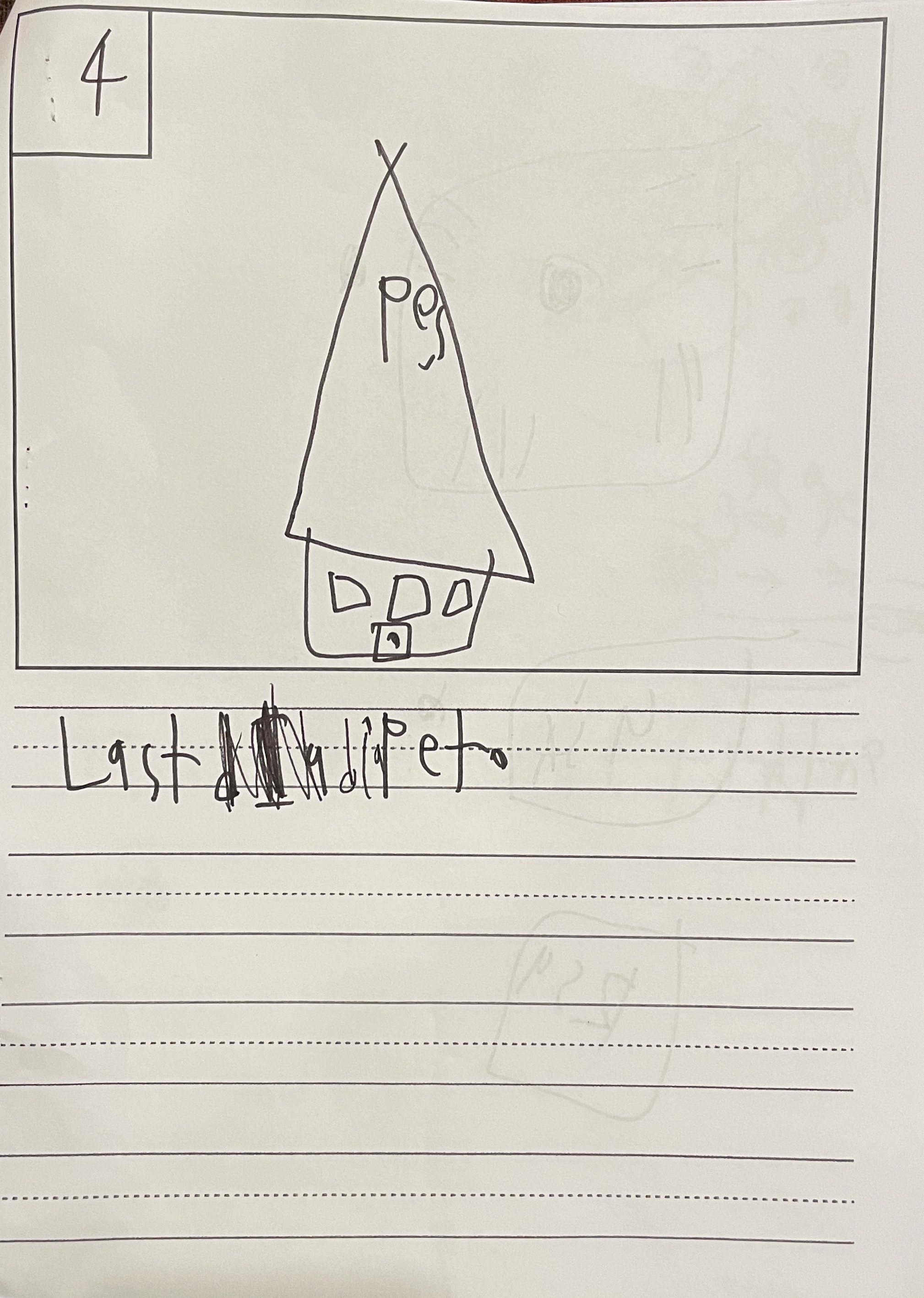 I usually begin with the illustrations because they are so compelling to me. Children’s drawings (especially when they are under the age of around ten or so–before they become too self-conscious), are magnificent. They are wiggly, uninhibited, masterful, and emotive. I love them. And so I start there. After I spend some time with the drawings, I move on to the letters and words. Sometimes they are clear and easy to read. Sometimes they are impossible. I do what I can and usually succeed in reading them, especially if I’ve had a chance to meet with the student and can recall what they intended to say.