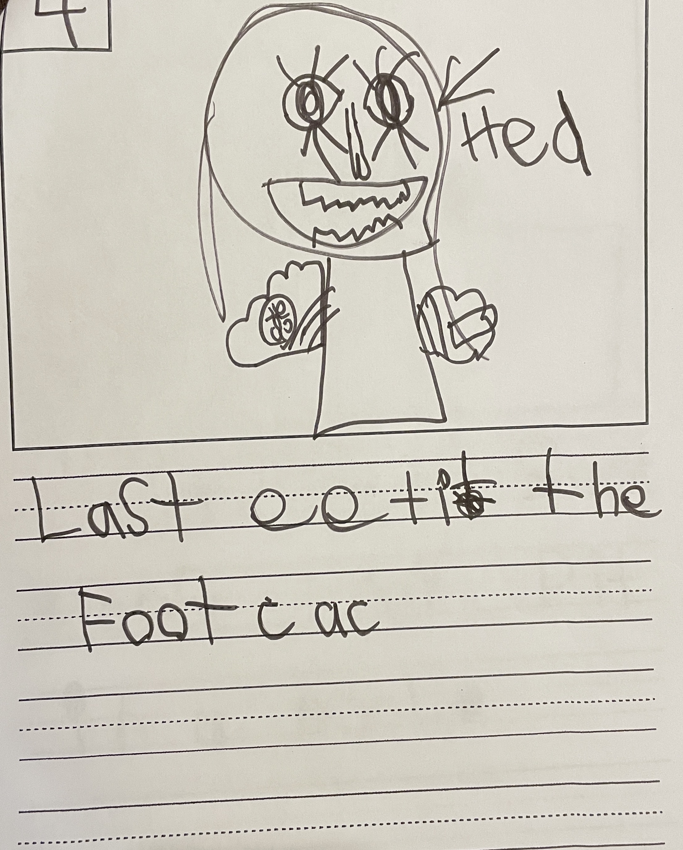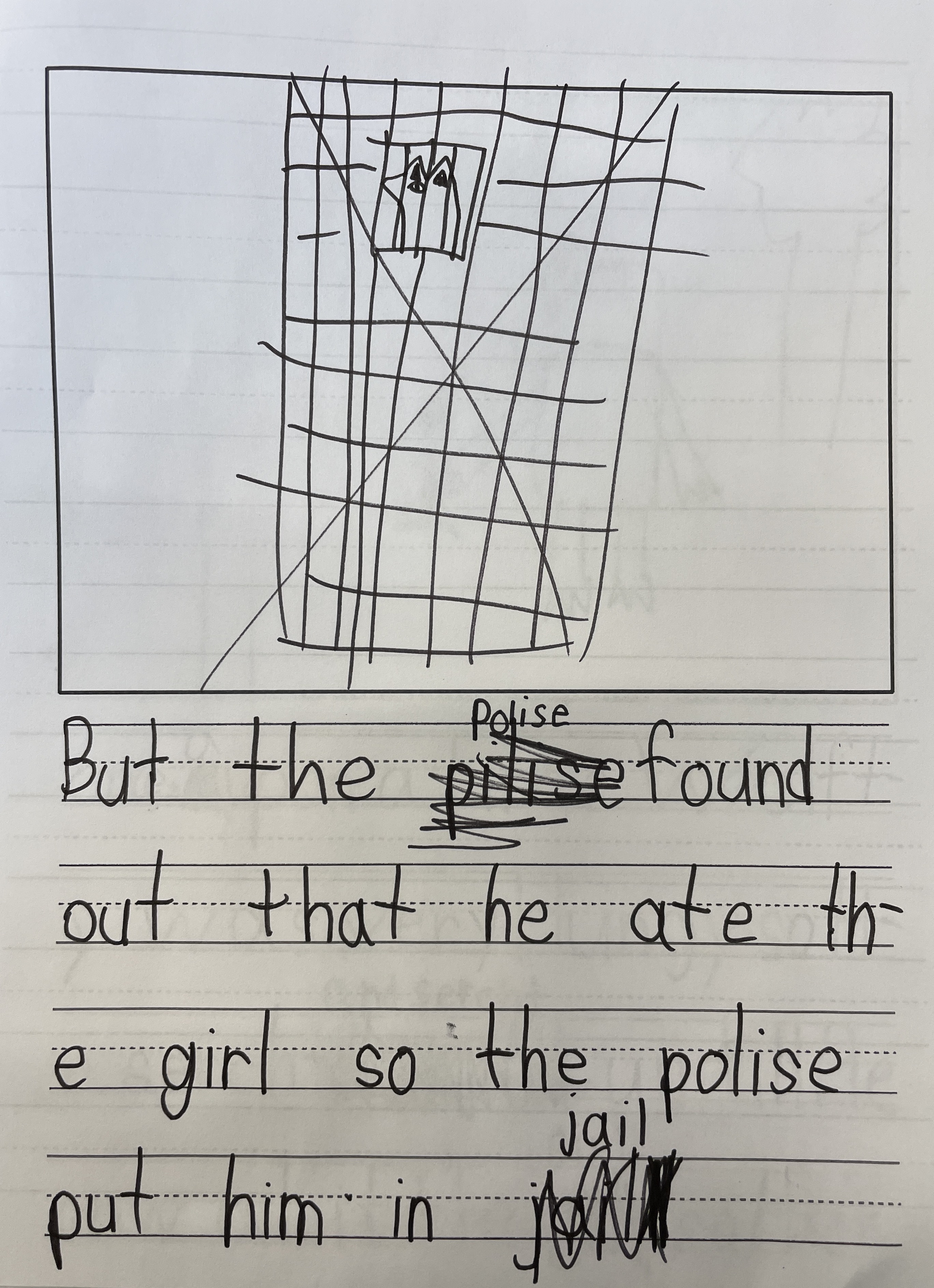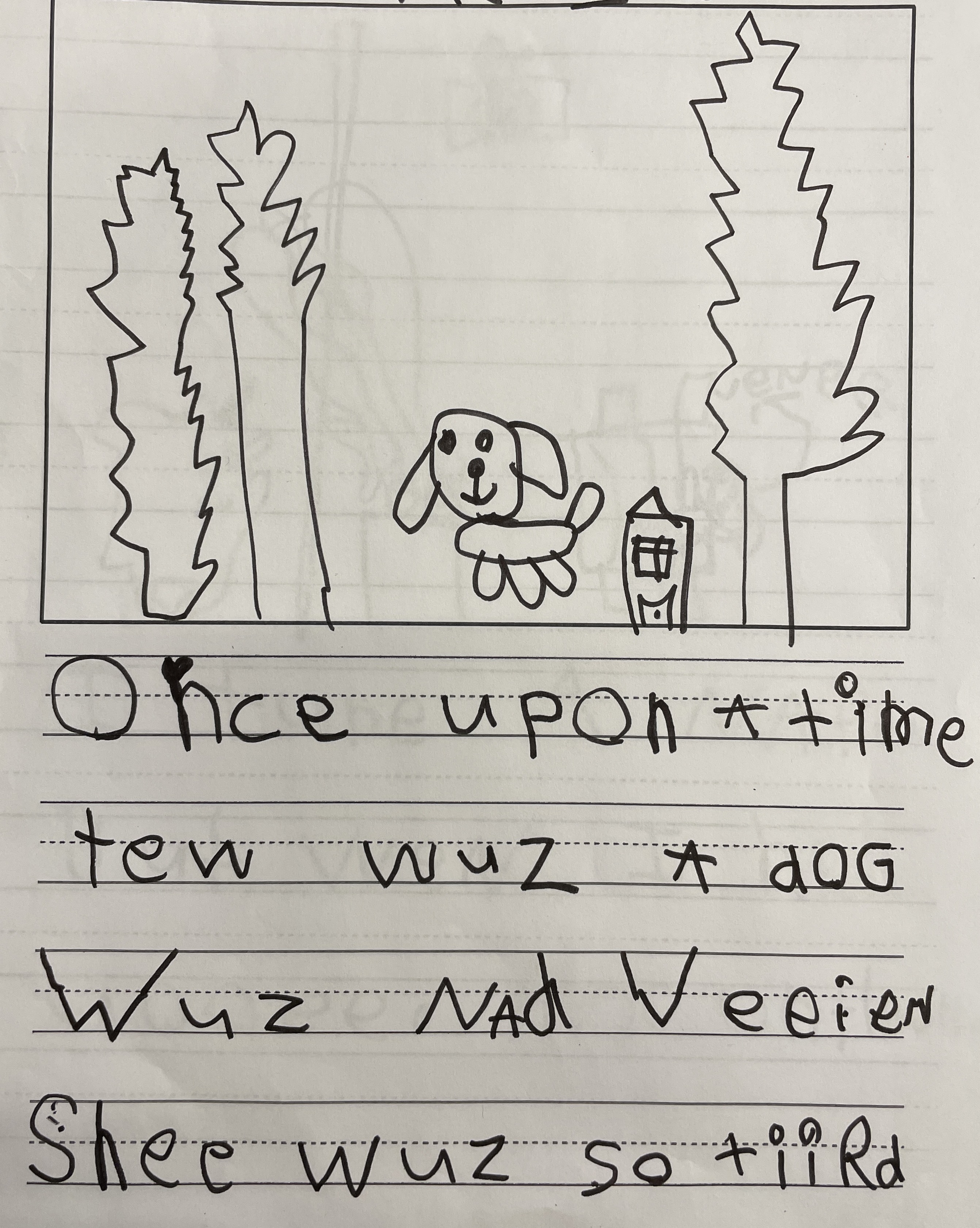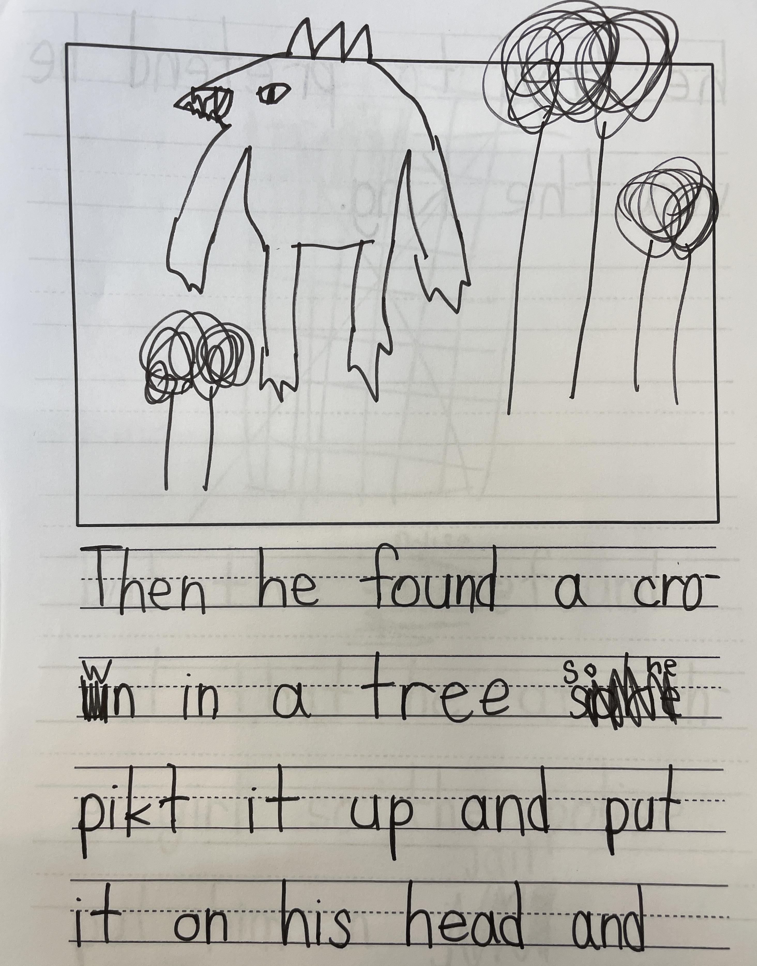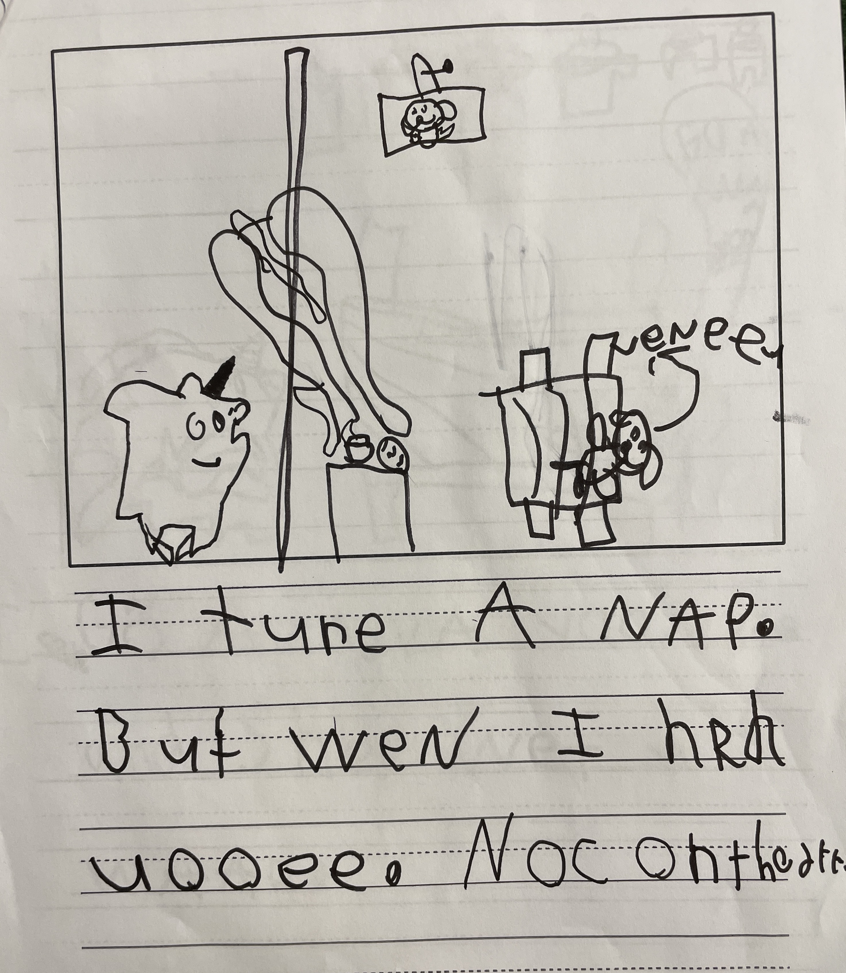 From there I ask myself a lot of questions. What is this student doing well? What are they not yet doing? Does their work have clear ideas? Does it have a voice? Is the work matter-of-fact? Is it silly? Is it serious? Is it something else entirely? How is it organized? Do they have a solid grasp of letter sounds? How are they doing with vowels? What writing conventions are they using? Are they incorporating dialogue? Is their work sequential? How did the work change over time? Does it make sense to me? More importantly, does it make sense to them?