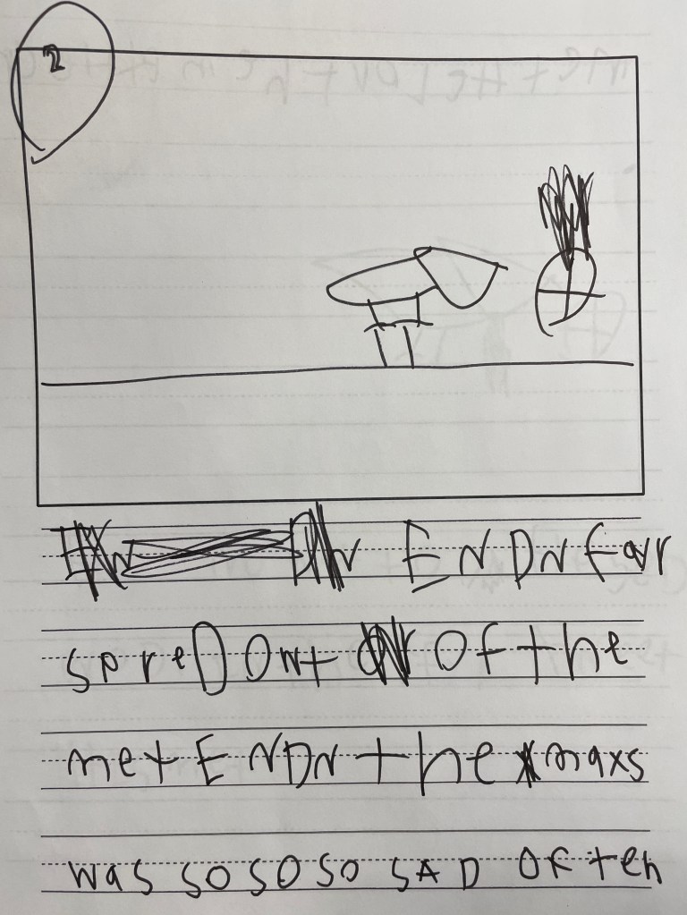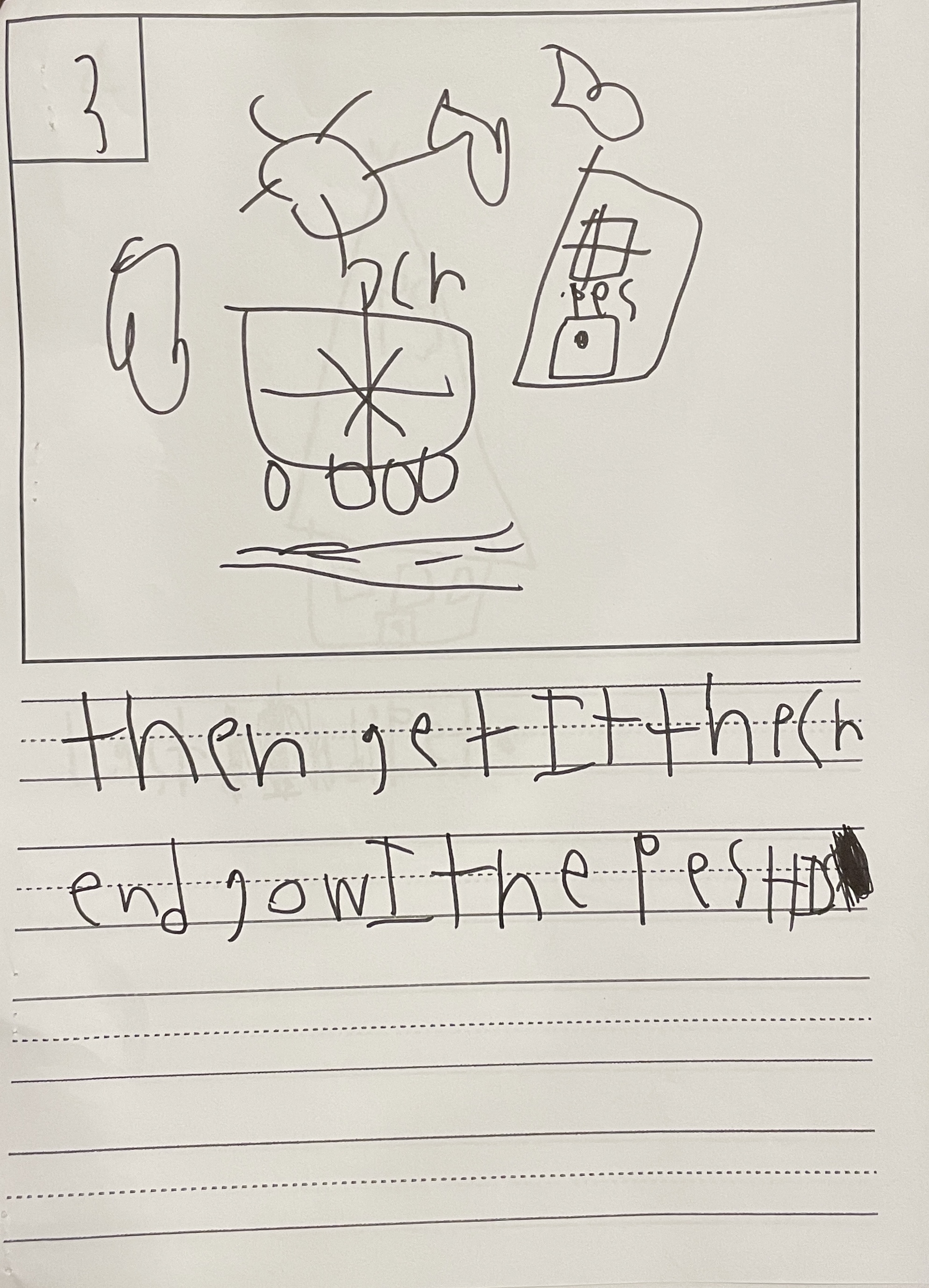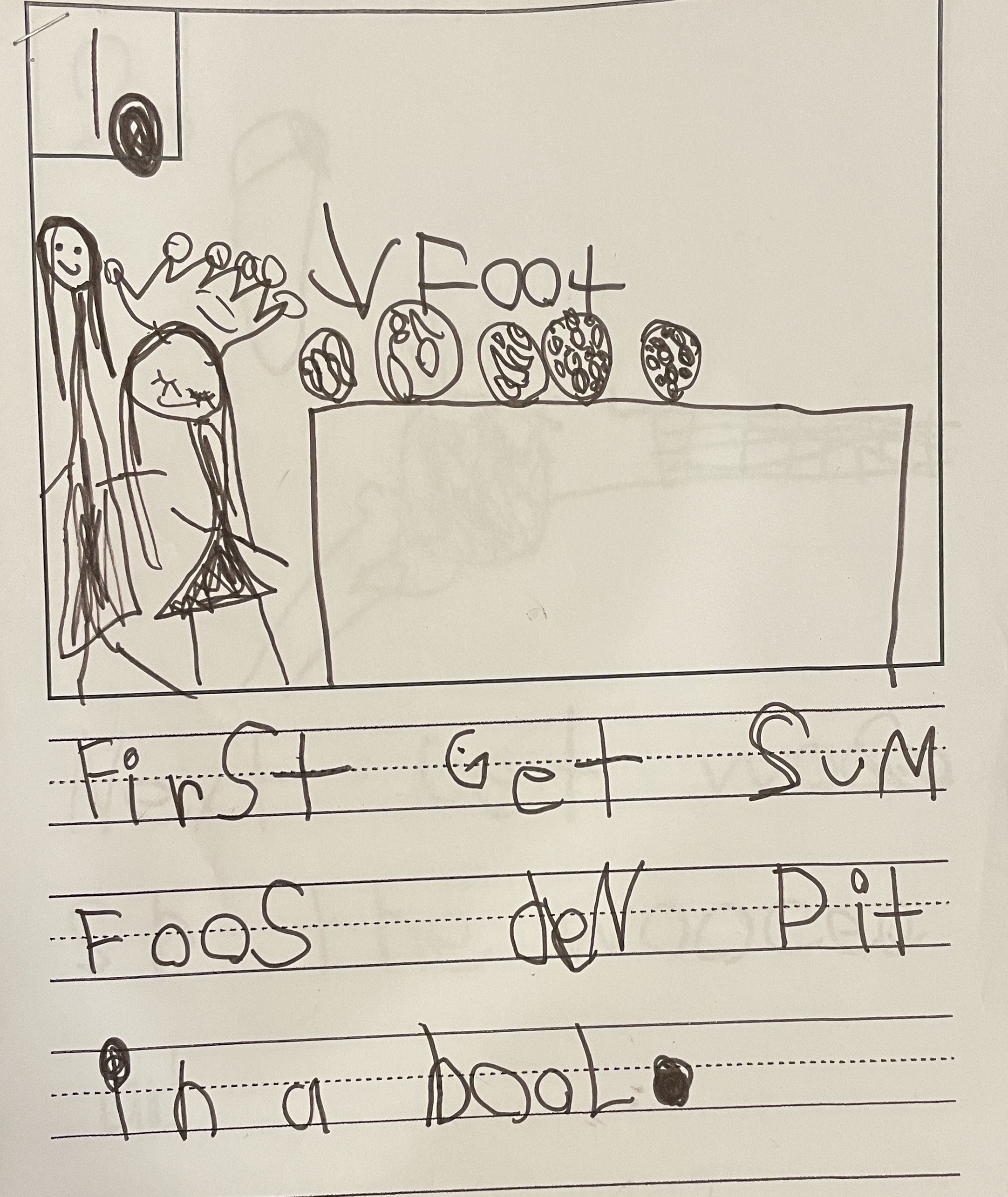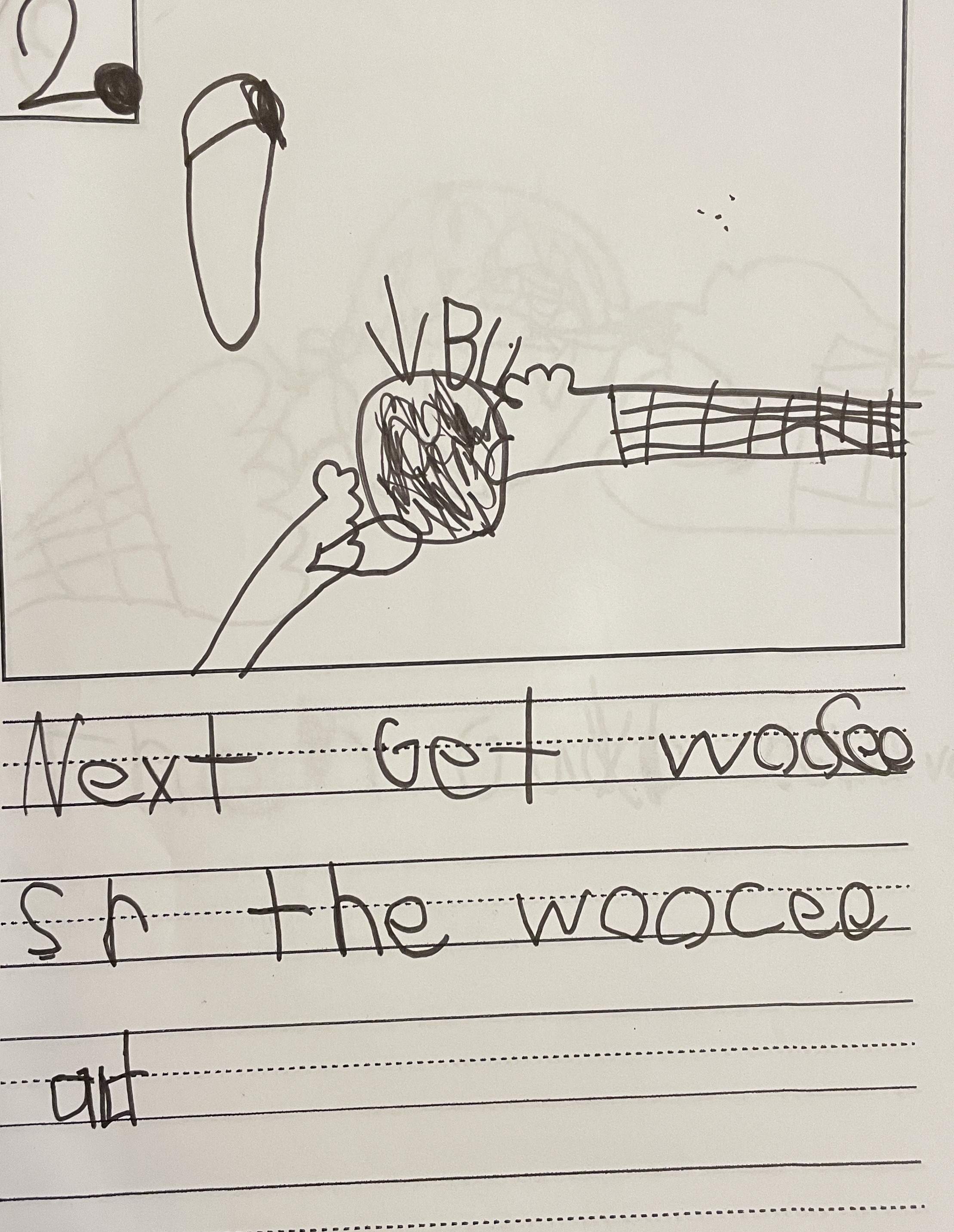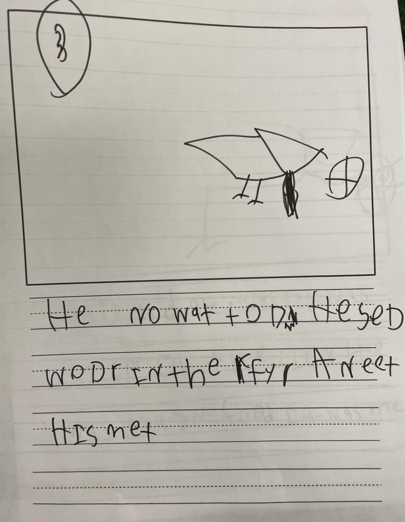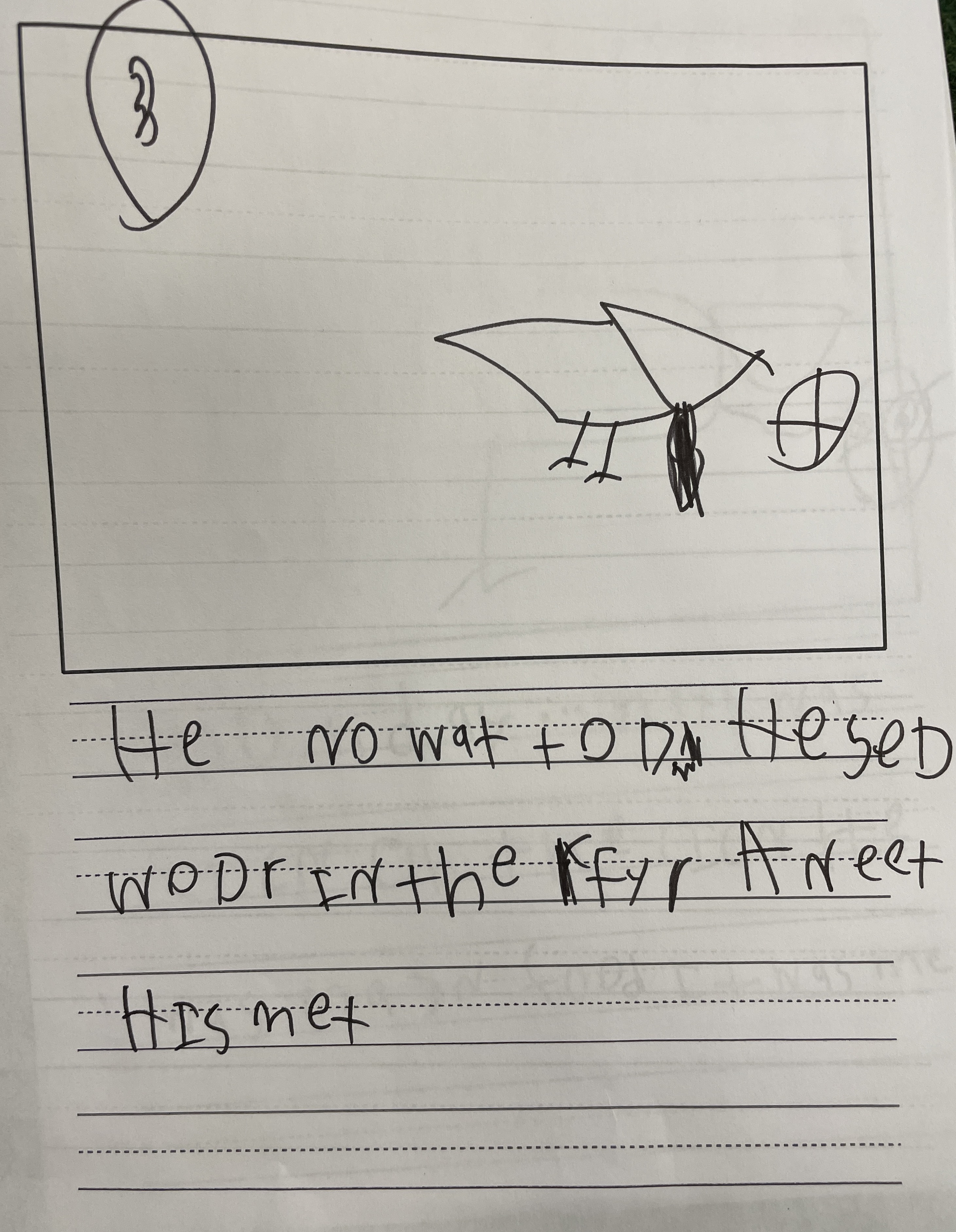 From there I ask myself a lot of questions. What is this student doing well? What are they not yet doing? Does their work have clear ideas? Does it have a voice? Is the work matter-of-fact? Is it silly? Is it serious? Is it something else entirely? How is it organized? Do they have a solid grasp of letter sounds? How are they doing with vowels? What writing conventions are they using? Are they incorporating dialogue? Is their work sequential? How did the work change over time? Does it make sense to me? More importantly, does it make sense to them?