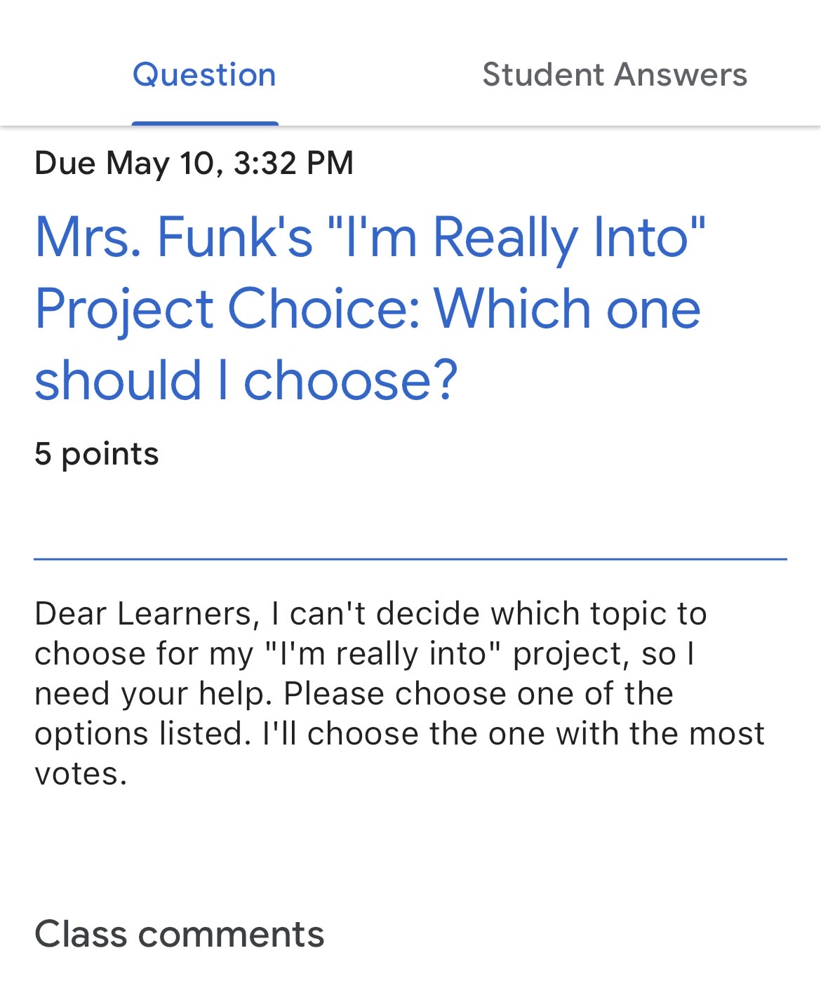 5. I wrote with students and modeled my writing process after seeking their input about what I should write about in a Google Classroom attendance question. Students chose travel as my topic: “I’m Really Into Travel.”