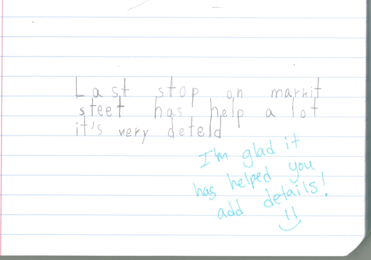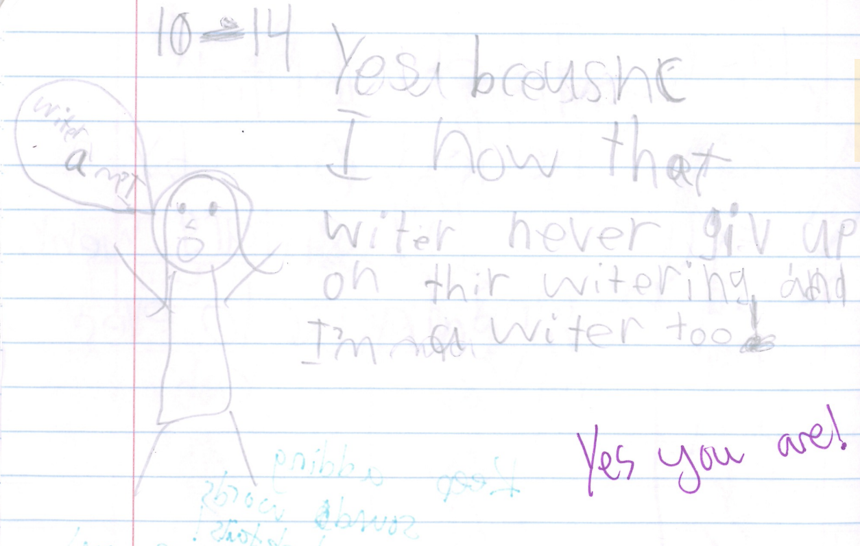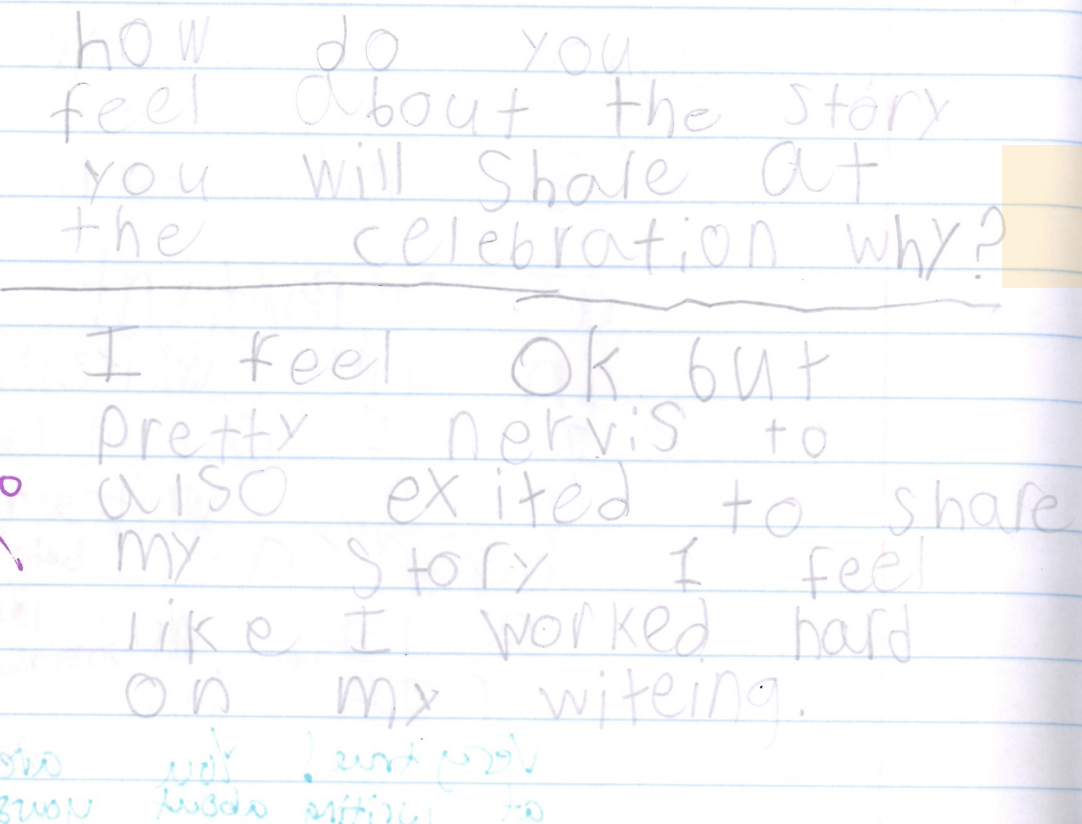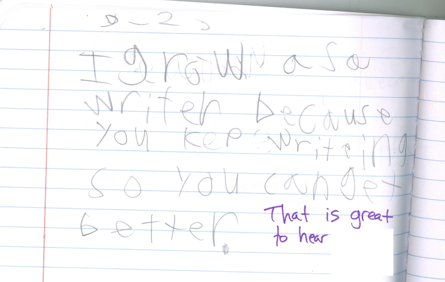 What I Learned: The reflective nature of these questions elicits more advanced and introspective responses than I’d expect from second graders, offering insights into their struggles and identities as writers. Take a look at some examples from student journals. Click to enlarge photos as needed.